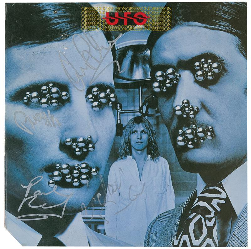Obsession album signed in silver ink by all four members. A few tiny spots of paper loss, remainder cut to the lower left corner, and a few scattered creases, otherwise fine condition. The record is not included.