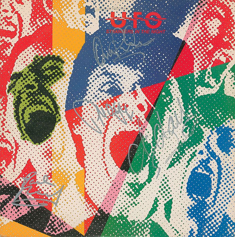 Strangers in the Night album signed in silver ink by Michael Schenker, Andy Parker, Phil Moog, and Paul Raymond. A few creases to lower right corner, mild album impression, and light contrast to signatures, otherwise fine condition. The record is included.