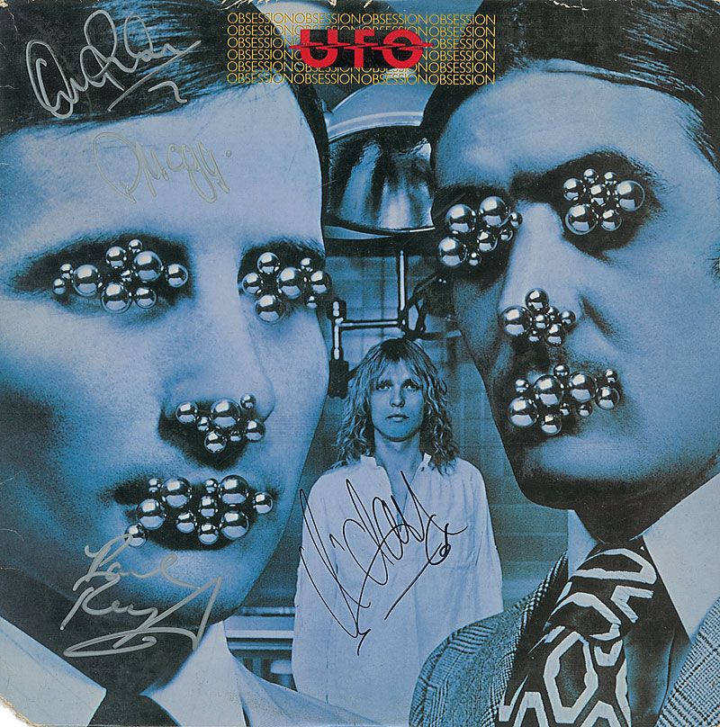 Obsession album signed on the front cover in silver ink and black felt tip by Phil Mogg, Andy Parker, Paul Raymond, and Michael Schenker. Clipped lower left corner and some scattered edge creases, otherwise fine condition. The record is included.