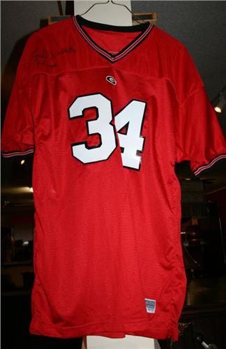 No. 34 University of Georgia red football jersey signed “Herschel Walker #34, Go Dawgs.” Size XL. Athletix Apparel.