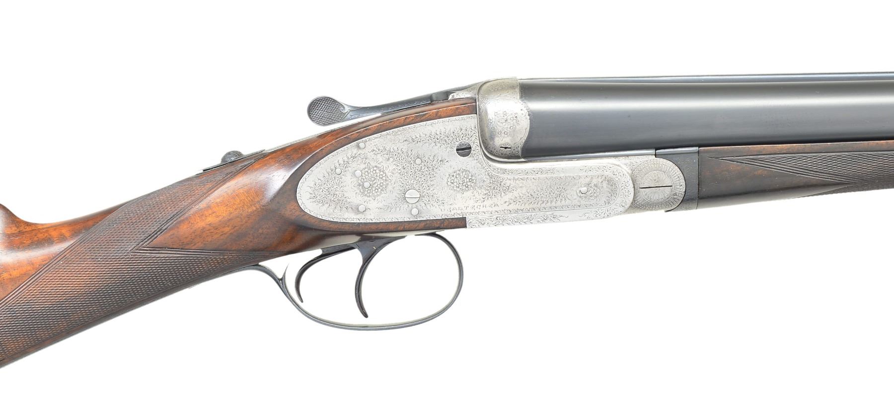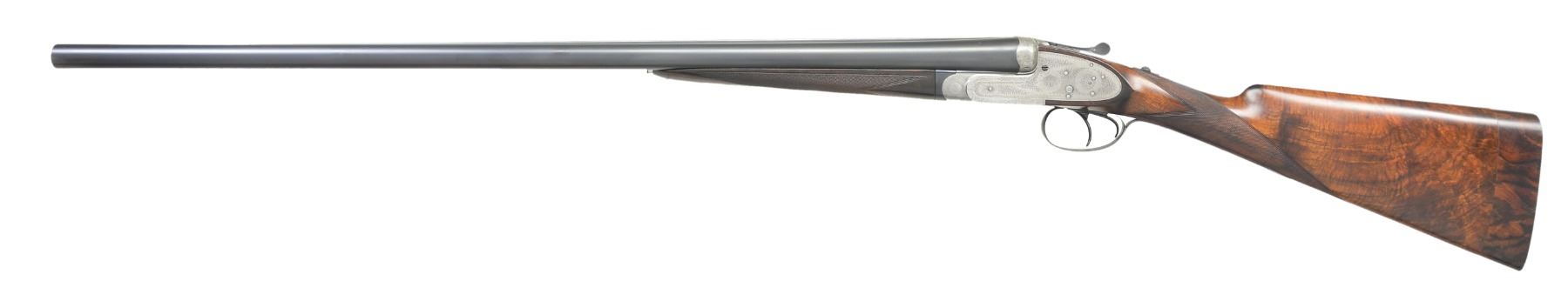 Cal. 12 Ga., 2-3/4". S# 22606. Bbls. 29-1/2". Self opening sidelock action featuring double under lug & third bite locking w/ side clips & cocking indicators. Selective ejectors. Double triggers, front trigger is hinged. Right edge of trigger guard bow is rolled. Splinter forearm w/ Anson release & straight grip stock of fancy European walnut w/ point pattern hand checkering. Toeline of stock has plugged hole for sling swivels, bbl. has plug screws in swivel base holes. LOP: altered to 14-3/8" over a 1-1/2" wood spacer w/ checkered butt. DAC: 1-1/2". DAH: 2-1/2". Stock has approx. 1/8'' cast off. Bore diameter: RT .735", LT .732". Choke constriction: RT .026", LT .035". Minimum wall thickness: RT .025", LT .022". WEIGHT: 7 lbs, 1.2 ozs. Mfg. 1950. CONDITION: bbl. has over 98% reblacked finish w/ weakly legible markings. Action has a cleaned soft gray appearance. Trigger guard & fittings have good reblued finish. Refinished wood shows small marks. Checkering is freshened. Forcing cones are lengthened. Right bore has an area of deep pitting forward of chamber. Left bore shows some light pitting. Action is tight & on face. (23-664/DS). CURIO. $1,000-1,500.