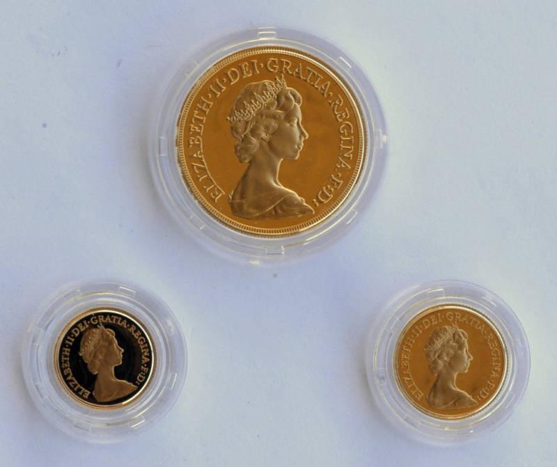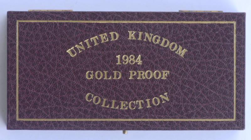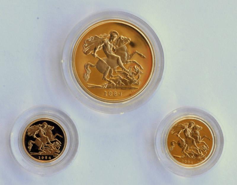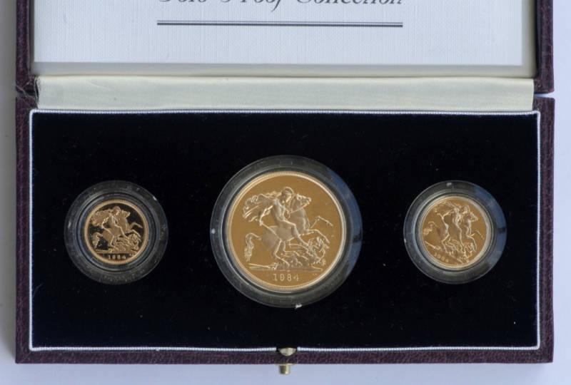 United Kingdom 1984 Gold Proof Collection 3 Coins Set. Three Gold Proof Coins as were produced by the Royal Mint. The coins are: Five Pound (39.94 gms) with an 8,000 mintage limit , Sovereign (7.99 gms) with a 22,500 mintage limit and Half Sovereign (3.99 gms) with a 22,500 mintage limit. All three coins are composed of 22 Karat of Gold and are uncirculated and have been maintained in their protective capsules.