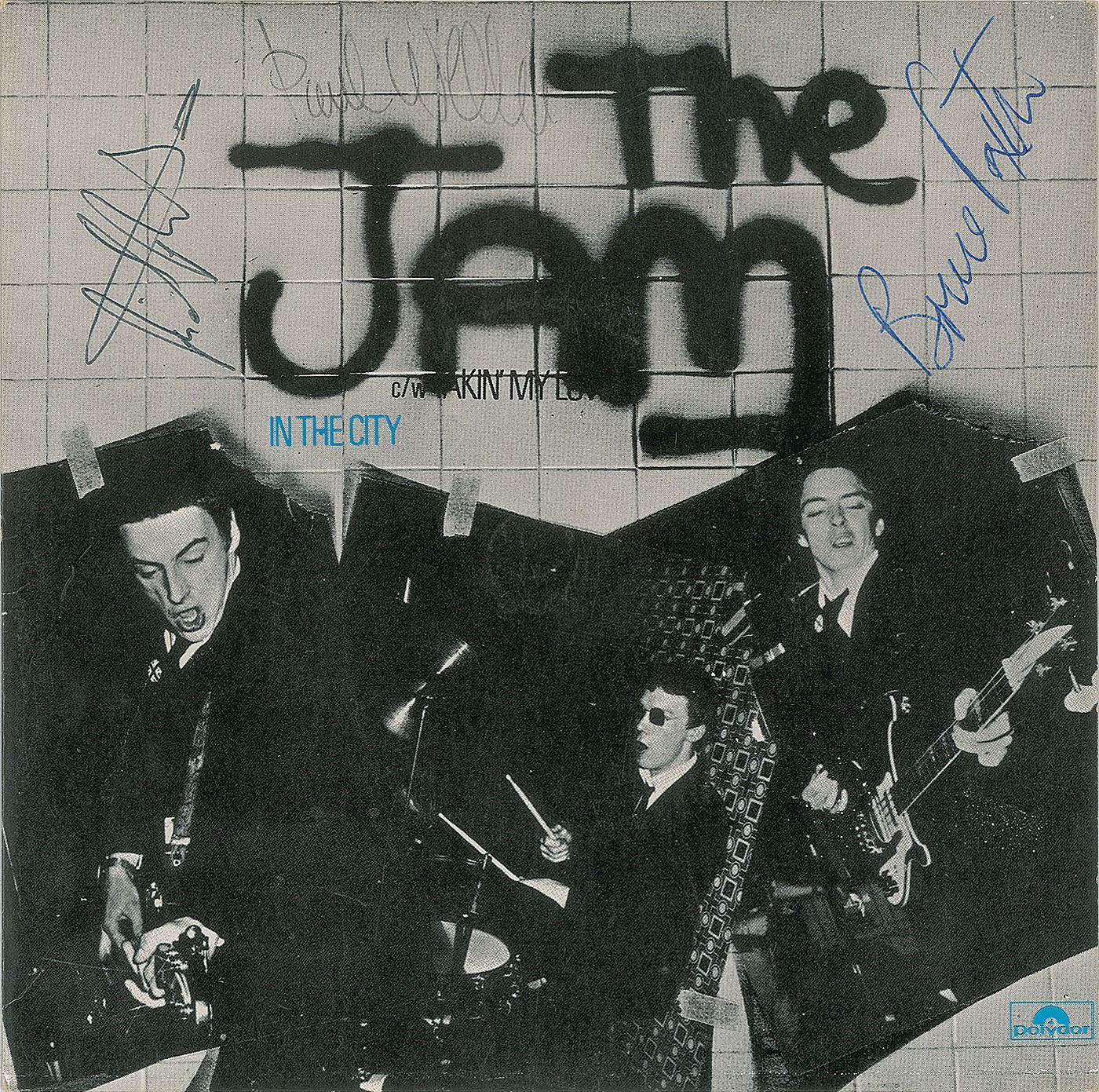 In the City album signed on the front cover in ballpoint by Paul Weller, Rick Buckler, and Bruce Foxton, who adds "The Jam." In fine condition, with some surface paper loss to the upper corners. The record is not included. Accompanied by a full letter of authenticity from JSA.