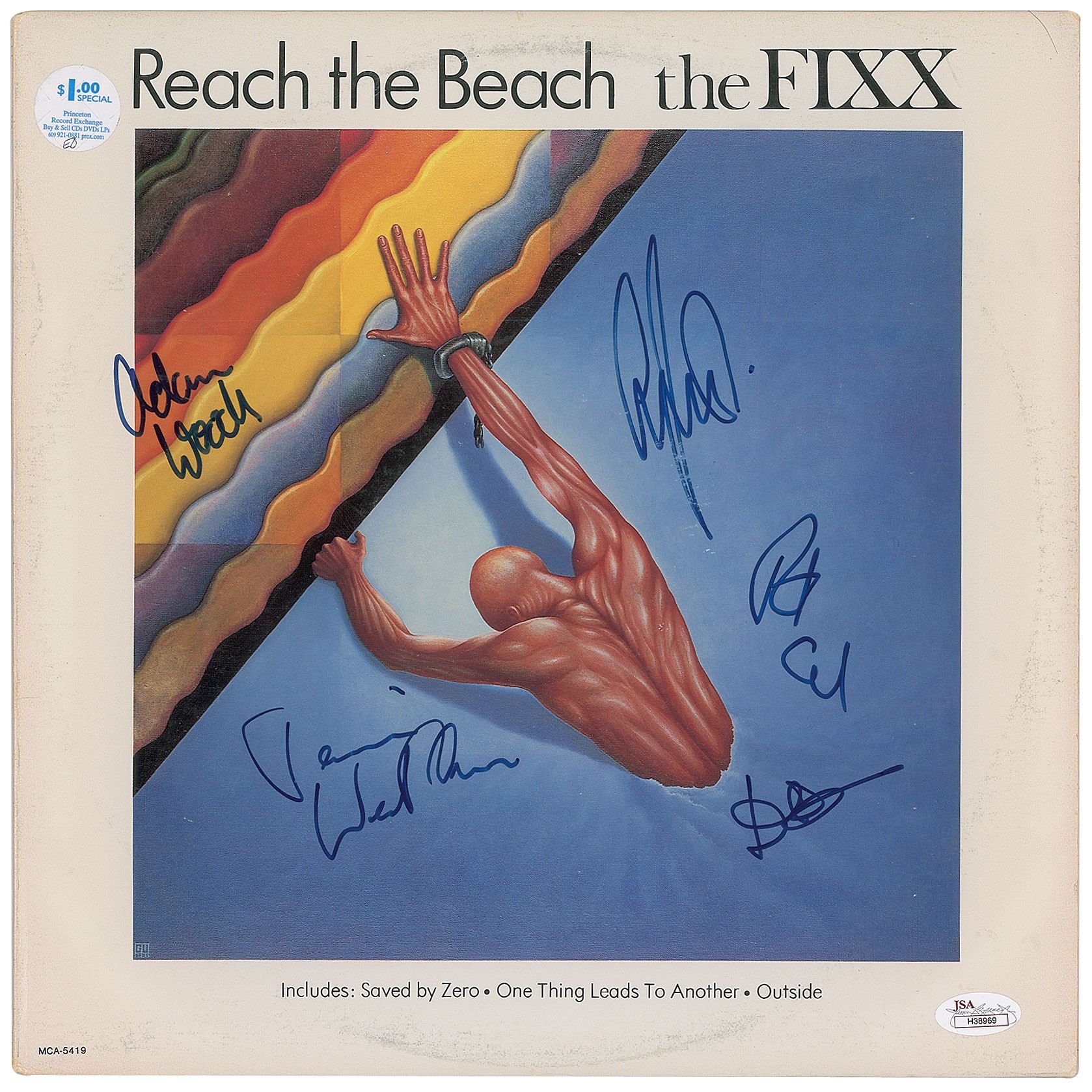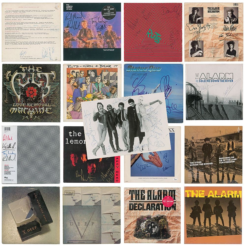 Collection of 13 items signed by members of eight notable UK rock bands, including: three albums by The Alarm—Declaration promo, self-titled EP, and Sold Me Down the River—each signed by Mike Peters, Dave Sharp, Eddie Macdonald, and Twist; V Deep promo album by The Boomtown Rats (Bob Geldof, Garry Roberts, Johnny Fingers, Pete Briquette, and Simon Crowe); Love Removal Machine single album by The Cult (Ian Astbury and Billy Duffy); Reach the Beach album by The Fixx (Cy Curnin, Rupert Greenall, Jamie West-Oram, Adam Woods, and Dan K. Brown); three items from The Mighty Lemon Drops—'Out of Hand' EP (Paul Marsh, Dave Newton, Tony Linehan, and Keith Rowley), a World Without End album (Marsh, Newton, Linehan, and Rowley), and a Happy Head promotional album (Marsh, Newton, Rowley, and Marcus Williams); a Grin & Bear It album and a 45 RPM single record for 'Babylon's Burning / Society' by The Ruts, both signed by David Ruffy, John Jennings, and Paul Fox, with the single also signed by Malcolm Owen; Just Supposin' album by Status Quo (Francis Rossi, Rick Parfitt, Alan Lancaster, John Coghlan, and Andy Bown; and a promotional postcard photo of The Tourists (Dave Stewart, Eddie Chin, Jim Toomey, Peet Coombes, and Annie Lennox. In overall very good to fine condition. The records are not included. Accompanied by 10 full letters of authenticity from JSA and REAL.