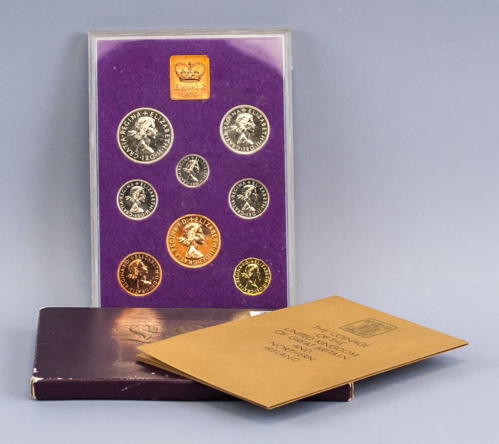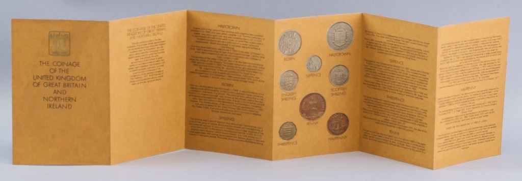 Coin set, from UK and Northern Ireland. Accompanied with box and coin guide. "The United Kingdom adopted a decimal coinage system on 15th February 1971. This proof set contains some of the last examples of the old coinage" printed on box. 12 x 17 cm. 220 grams.