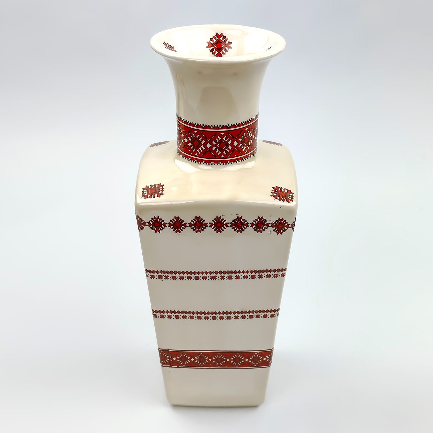 #8858 - UNMARKED - VINTAGE HAND CRAFTED UKRAINIAN CERAMIC VASE. RED & BLACK CROSS STITCH PATTERN. MEASURES: 10.5” (26.5 CM) TALL BY 4” (10 CM) SQUARE AT WIDEST PORTION***ITEM(S) LOCATED IN LETHBRIDGE ALBERTA. FREE TRANSPORT TO EDMONTON OFFICE AVAILABLE FOR THIS AUCTION. WORLDWIDE SHIPPING IS AVAILABLE FOR ALL ITEMS