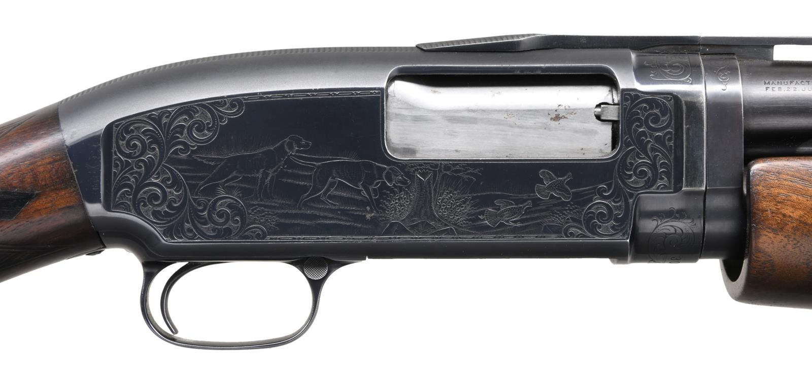 PUMP SHOTGUN. Cal. 12 ga., 2 5/8". S# 300678. Bbl. 30" of nickel steel with milled vent rib and duck bill receiver extension. Fixed full choke. White target front sight with steel mid bead. Pigeon-grade factory engraving by George Ulrich, Winchester's most prestigious engraver from 1919 to 1949. The right side of the action features an upland scene with two pointing dogs and two flushing partridges. The left side features a marsh scene depicting four flying mallards. Scenes are bordered by a vine-type foliate scroll that extends to the front portions of the receiver and the trigger guard bow. Extension beavertail forearm with pigeon-grade diamond checkering and an early style pistol grip stock of fancy walnut. Stock features trap-grade checkering with black diamonds on both sides of the wrist. LOP: 14 1/8" over an aftermarket solid red London style pad. Mfg. 1922. CONDITION: action retains over 90% reblued finish; engraving shows mild polishing. Bbl. and mag. tube retain 80% of the lightly worn blue showing slide wear. Refinished wood shows wear and handling marks with thinned checkering. Stock has a very small chip left of the trigger guard tang. The recoil pad is age-hardened and cracking. Very good, bright bore. Hammers will drop before action is closed and must be repaired to be safe. (23-5157/DS). CURIO. $3,500-5,000.