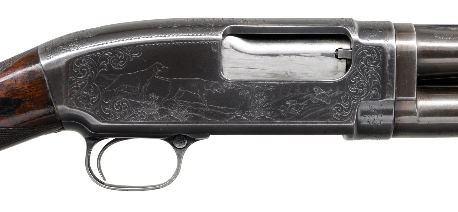 SHOTGUN. Cal. 20 ga., 2 3/4" chamber. S# 606111. Bbl. 26" of nickel steel with a solid rib. Fixed mod choke. George Ulrich was a primary engraver of Winchester shotguns from 1919 until his untimely death in 1949. The right side of the action features a woodland scene with two pointing dogs and two flushing partridges. The left side features a waterfowl scene with four flying mallards. Scenes are surrounded by highlights of a vine-type foliate scroll that extends to the upper and lower receiver areas, as well as a trigger guard bow. Small forearm and straight grip stock of fancy walnut with wraparound trap grade checkering having black diamonds on both sides of the wrist. LOP: 13 3/4" over an aftermarket Jostam red ventilated pad. Mfg. 1930. CONDITION: 70% fading, reblued finish with a slightly plum cast on the bbl. Receiver sides retain some roughness, and engraving shows light polishing wheel distortion. Stock and forearm have added finish over light wear with scattered scratches, marks, and small dents. The recoil pad is cracking and being crushed from age or heat. Very good, bright bore. Action is sound and on time. Four notches are taken up on the headspace ring. (23-5156/DS). CURIO. $3000-5000.