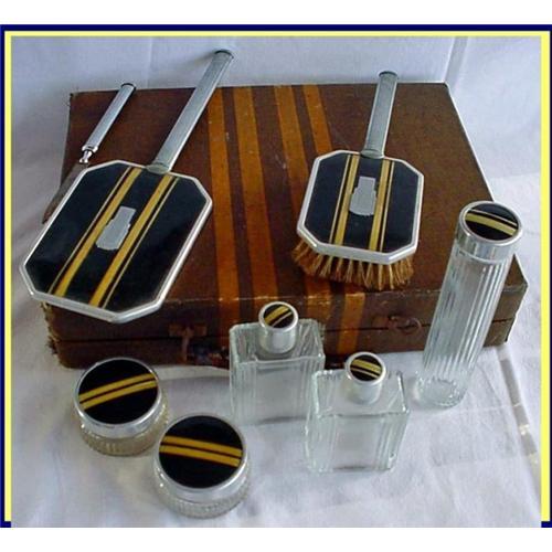 Bottles made of fluted glass have a small raised line on the bottom, which is the maker's mark. Silver plate and enamel tops to all pieces have a fantatic Art Deco geometric, linear design in yellow, gold and black. The design is repeated on the box. Mirror and brush have an applied silver ornament, also clearly Art Deco in style. The box's original lining has some water damage. Lock is in good working order. Original leather handle is worn beyond repair and should be replaced. Enamel is in good condition with minor wear. All other parts are in very good, probably unused condition. No chips/cracks/dents to glass and silver.