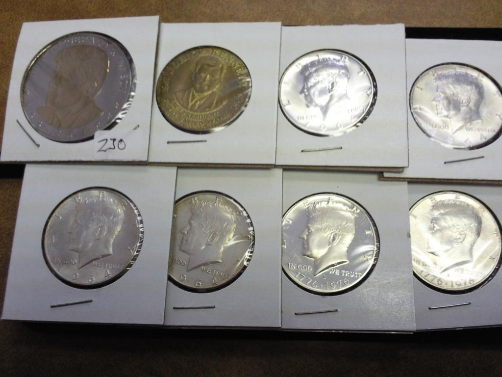 1963 & 85 MEMORIAL TOKENS, 64 HALF DOLLAR (GEM PROOF), 3-1964 HALF DOLLARS, 76-40% SILVER PF AND 1976 UNC 40% SILVER
