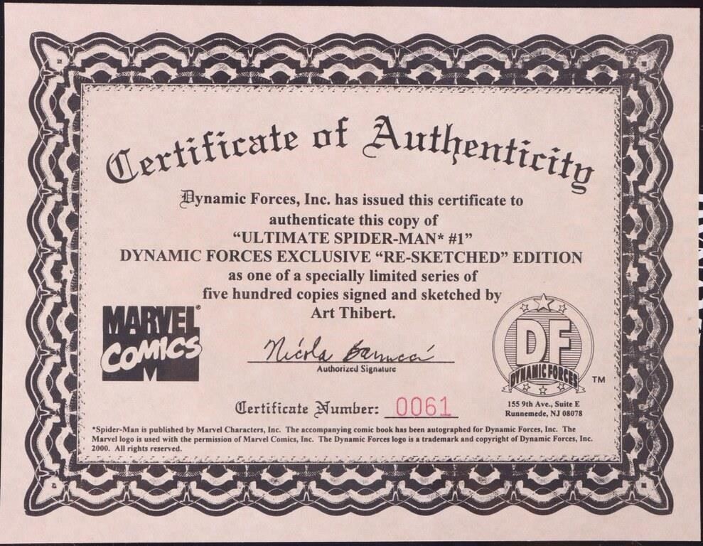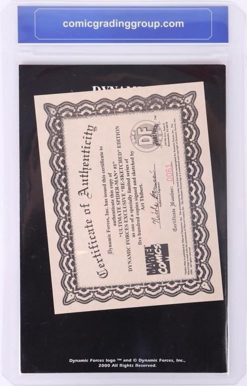 Ultimate Spider-Man #1 dynamic forces variant comic book. Signed by Art Thilbert. Comes with a certificate of authenticity and has benn graded 9.0 by CGG. Variant cover art by Joe Quesada, limited to 5,000 copies