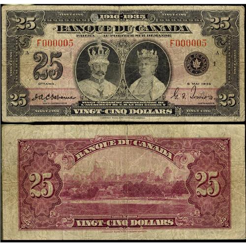 ULTRA LOW SERIAL #000005. BC-12 1935 $25 French text #F000005.VG+. WOW!!!. Low serial number. A must see. RARE