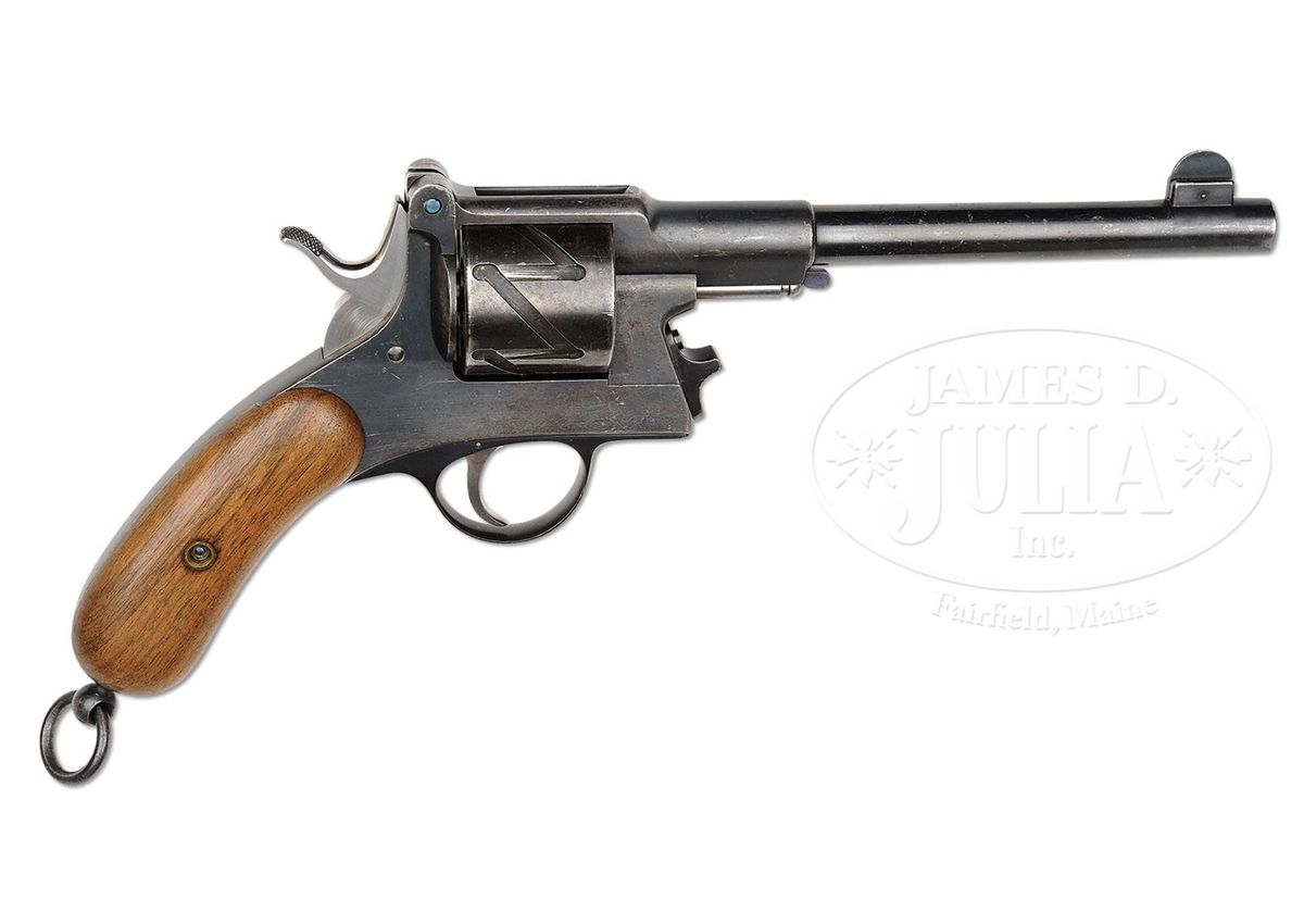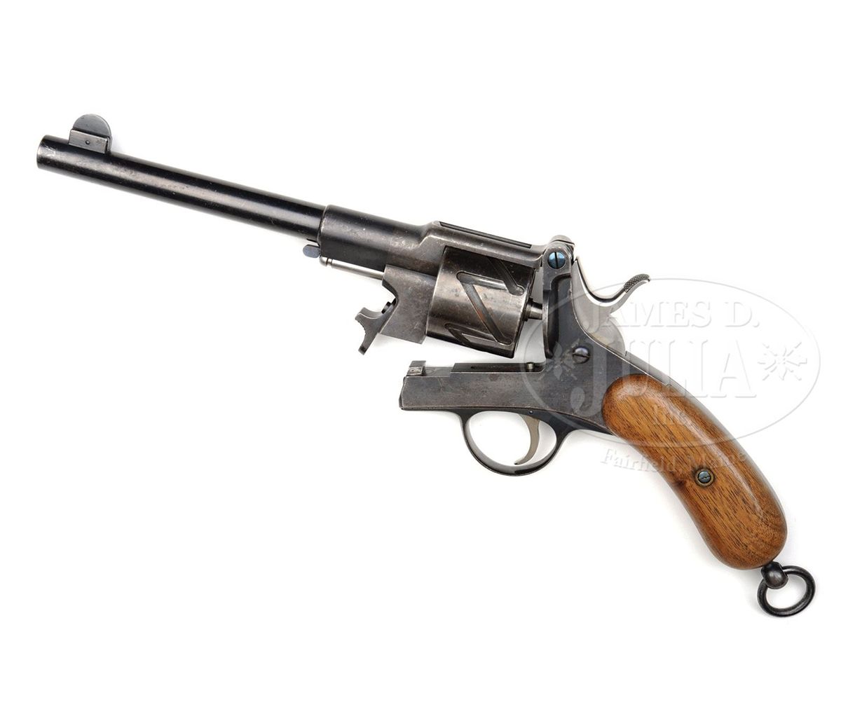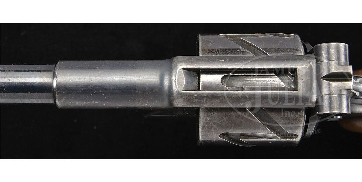 Cal. 10.6mm Rimmed. This is a very rare example of Paul Mauser’s last attempt to make the Zig-Zag revolver acceptable for military service, a patent model of DRP 2564 of 2 March 1878, “Neuerungen an Revolvern” (Improvements in Revolvers), only a handful of examples of which were made for German Army trials in 1878/79. This was without success since the M79 Reichsrevolver was adopted, after which Mauser made no further developments of the Zig-Zag revolver. Chambered for a unique bottlenecked cartridge, not the standard German Service 10.55 mm Revolver cartridge, the only other known example is in the Smithsonian Institution. Blue finish with 7-3/16" rnd bbl, half-moon front sight in a rectangular base with fixed rear sight in the top strap. Front of the frame has the unique last style sliding latch which allows the bbl to be tipped up for loading & unloading. Grip frame is bag-shaped with a lanyard swivel in the butt and mounted with smooth 2-pc walnut grips. Cylinder is very unusual with Z-shaped grooves around outer diameter which are, in fact, rotating grooves for the cylinder. Cylinder rests on a pin which is in a groove and when the hammer is cocked it advances the cylinder to the next chamber for firing. Left front side of the bbl lug has a small thumb latch which is a cylinder lock that fits into a notch in the extended front rim of the cylinder and if not latched the bbl cannot be opened. This prototype is completely unmarked and bears no proof marks either. PROVENANCE: Collection of Dr. Geoffrey Sturgess. Ex-Visser collection. CONDITION: Very fine. Overall retains about 95% strong orig blue with bright blue on the bbl and brushed finish on the frame & grip frame; cylinder & trigger guard are also bright blue with bright polished hammer & trigger. Grips are sound with only a minor nick or so and retain most of their orig varnish. Mechanics are crisp, brilliant shiny bore. May be unfired. 4-52565 JR390