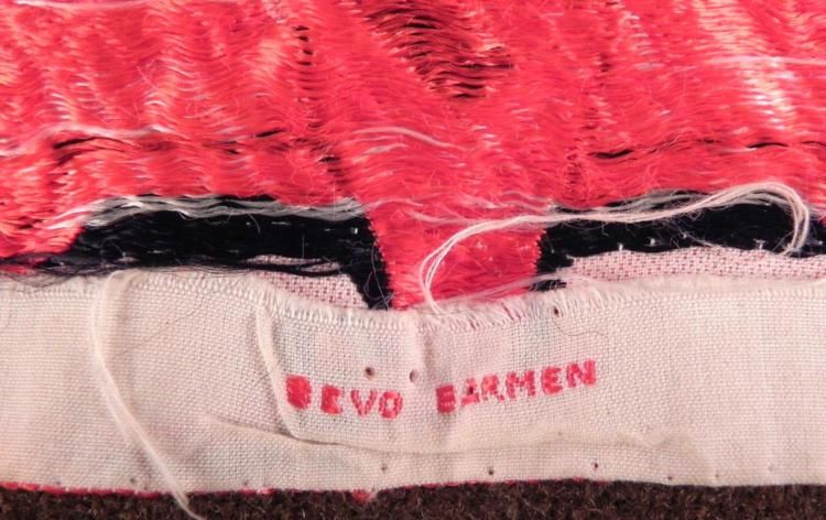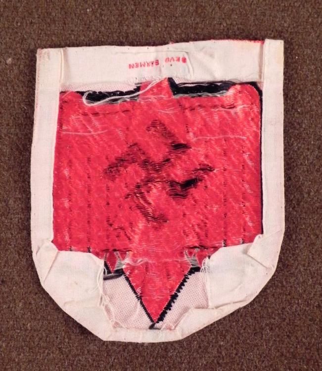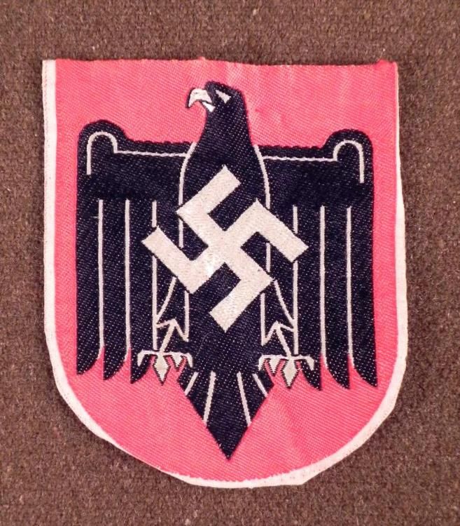 ULTRA-RARE NAZI BEVO-EMBROIDERED OFFICIAL'S SPORTS PATCH/BADGE FOR"FORMAL SPORT COATOUTSTANDING SHIELD SHAPED 3 1/4"" X 3 3/4"" BEVO"WEAVE SILK NAZI ATHLETIC GAMES BLACK EAGLE WITH WHITE SWASTIKA ON REDBACKGROUND WITH WHITE BORDER--USED BY OFFICIALS AT SPORTS GAMES WITH"WEHRMACHT NAZI SOLDIERS COMPETING-BACK MARKED ""BEVO BARMEN""---GUARANTEED"ORIGINAL
