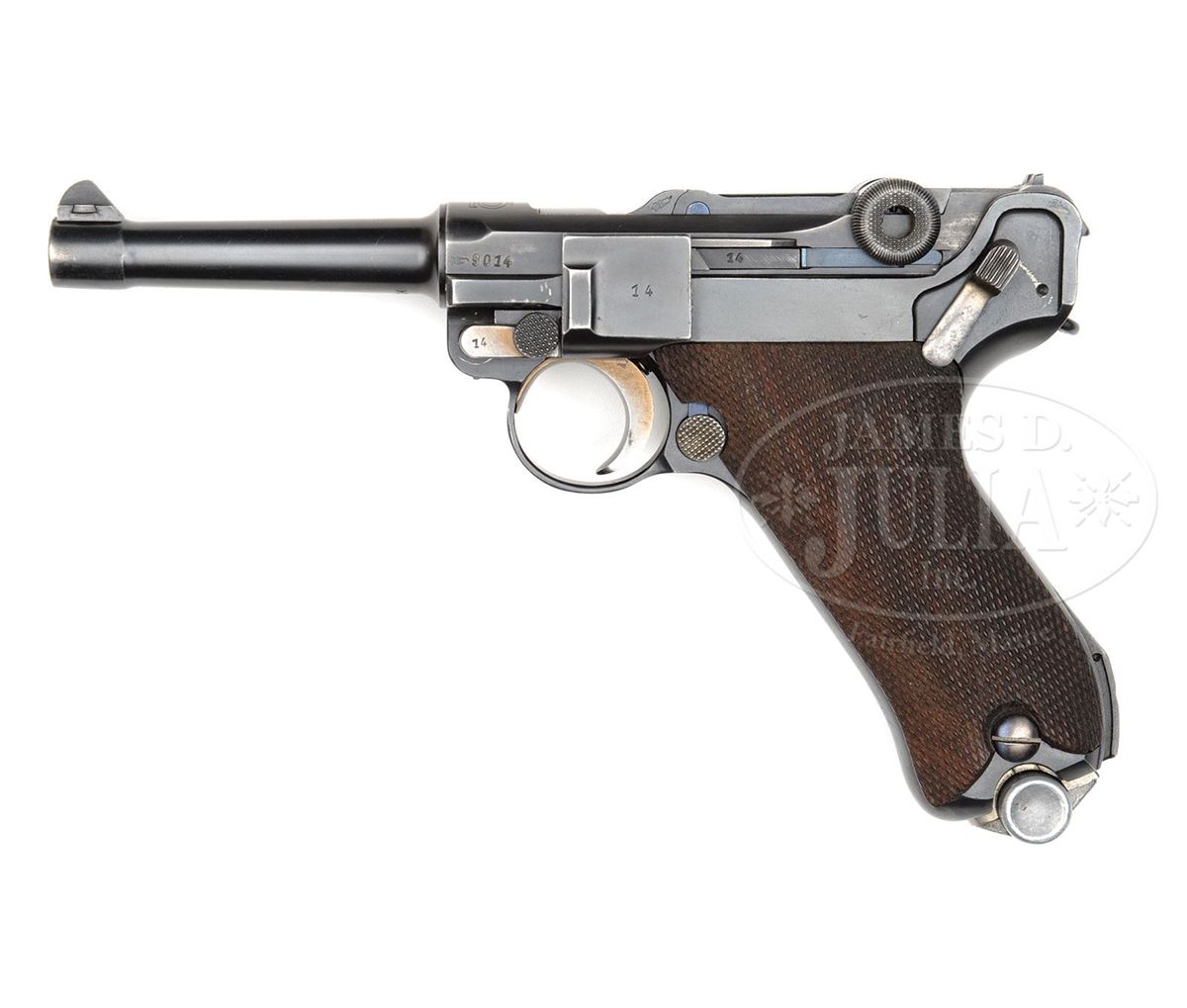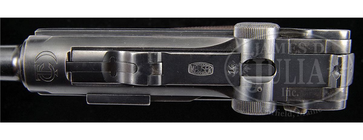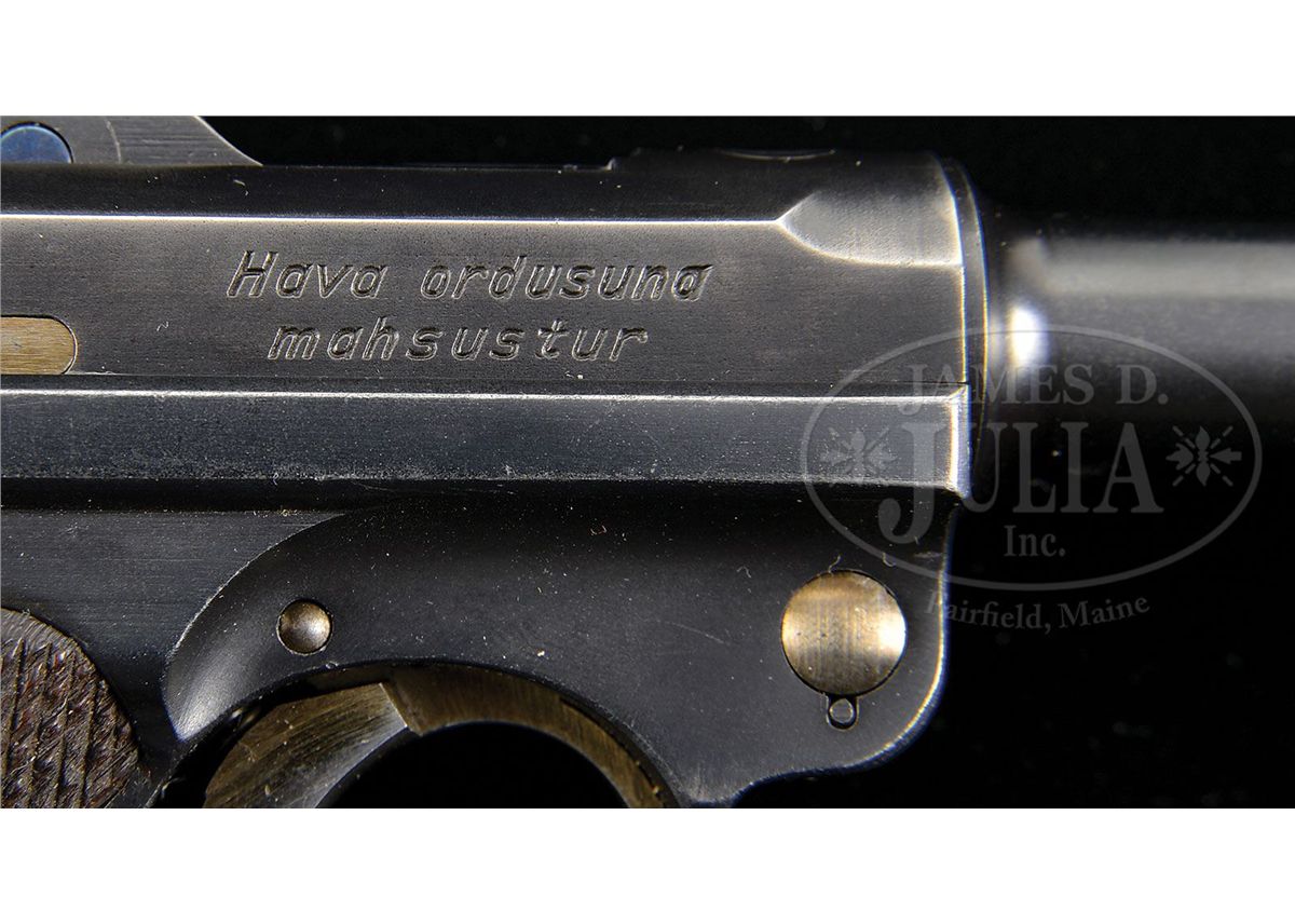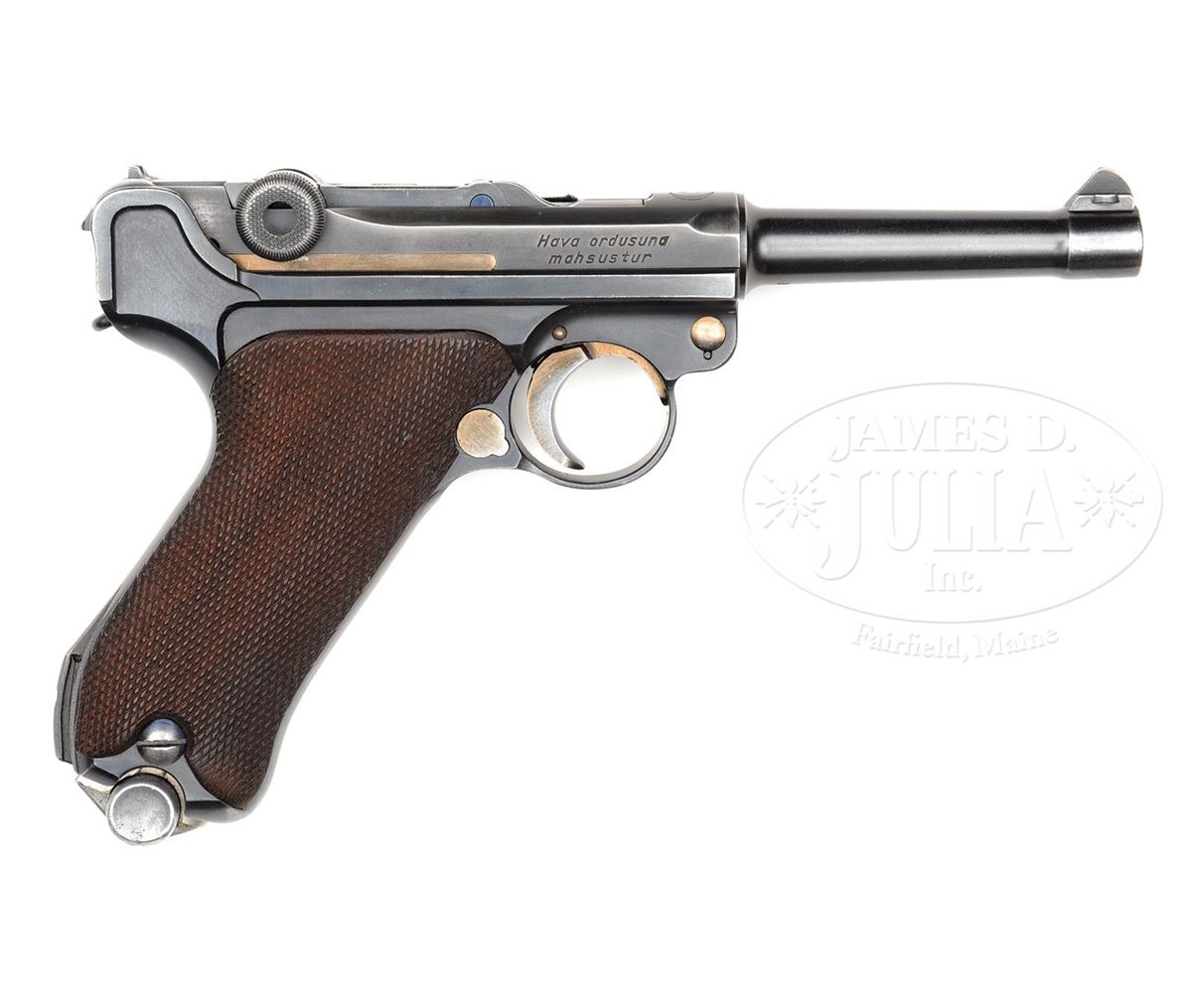 SN 9014v. 4" 9mm bbl. "TC" with crescent moon Turkish crest on chamber. Mauser banner on center toggle link. "Hava ordusuna / mahsustur" (“Air Army Property”) on right side of receiver. Crown/Crown/U proofs on toggle and left side of receiver. Proper "v" range serial number. Plain aluminum bottom magazine. All numbered parts are matching including the checkered walnut grips. This gun is featured in Dr. Geoffrey Sturgess' The Borchardt & Luger Automatic Pistols on pp. 540, 785, 786, and 827. This gun is also featured in Third Reich Lugers by Jan C. Still on p. 196. With documentary provenance of issue to Turkish Air Force FW190 pilot Mustapha Tunca (KIA 1944) that include copies of correspondence, Turkish ownership permits, original documents, and a signed testamentary photograph of the gun. This is the only correct Turkish Airforce issued example known of this exact configuration. PROVENANCE: Collection of Dr. Geoffrey Sturgess. CONDITION: Excellent condition retaining 95% original blue and about 80% original straw with light corrosion on the safety lever. Bore is bright and sharp. Grips are lightly worn. Magazine is excellent. Mechanics are excellent. 4-52896 BWS12