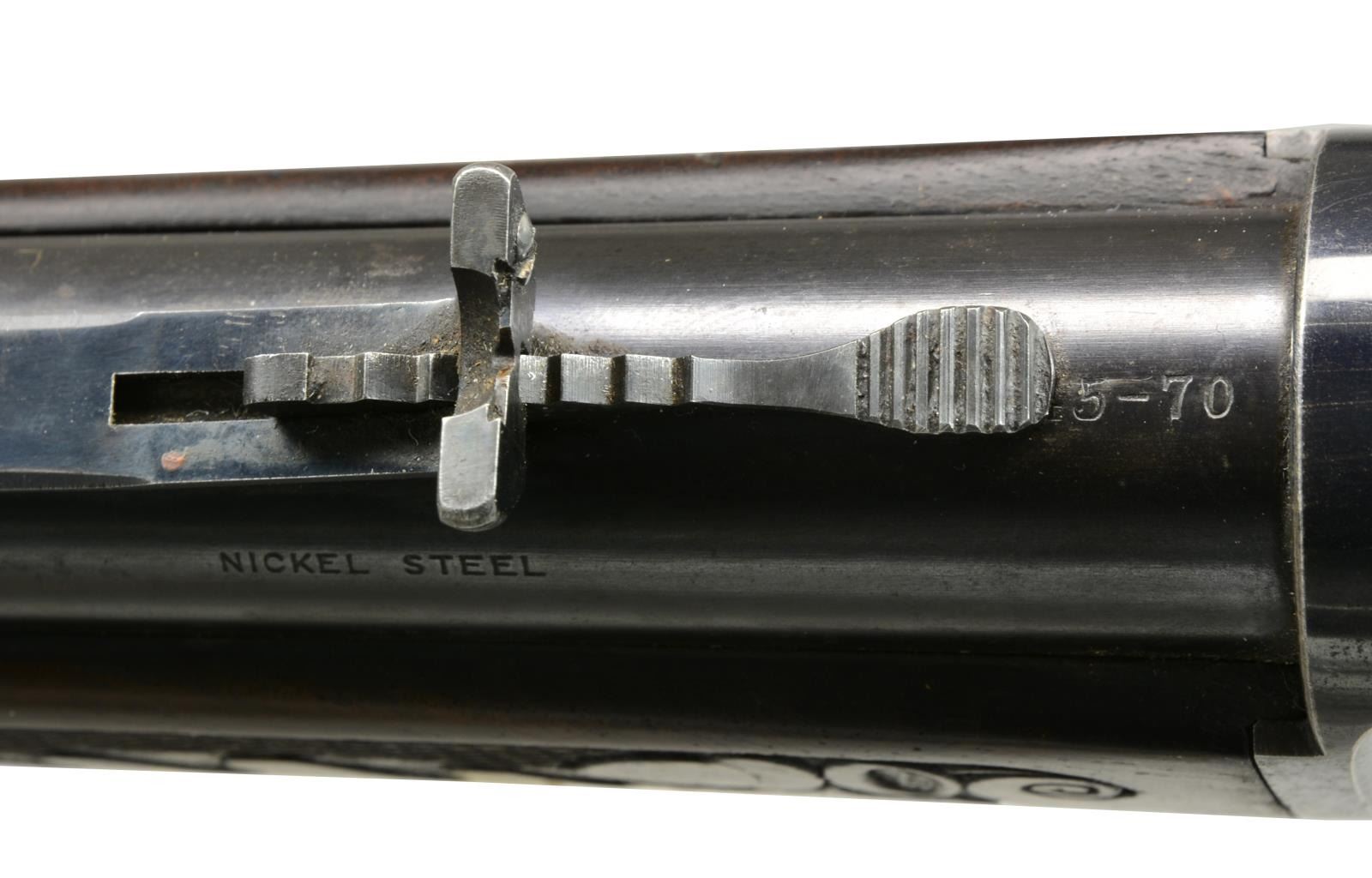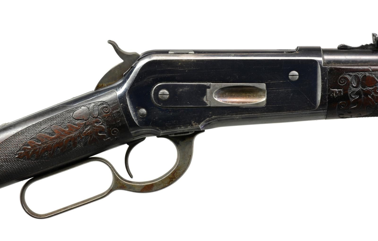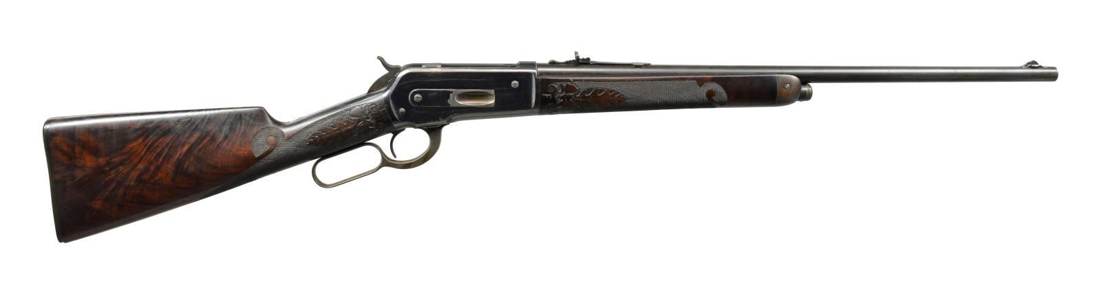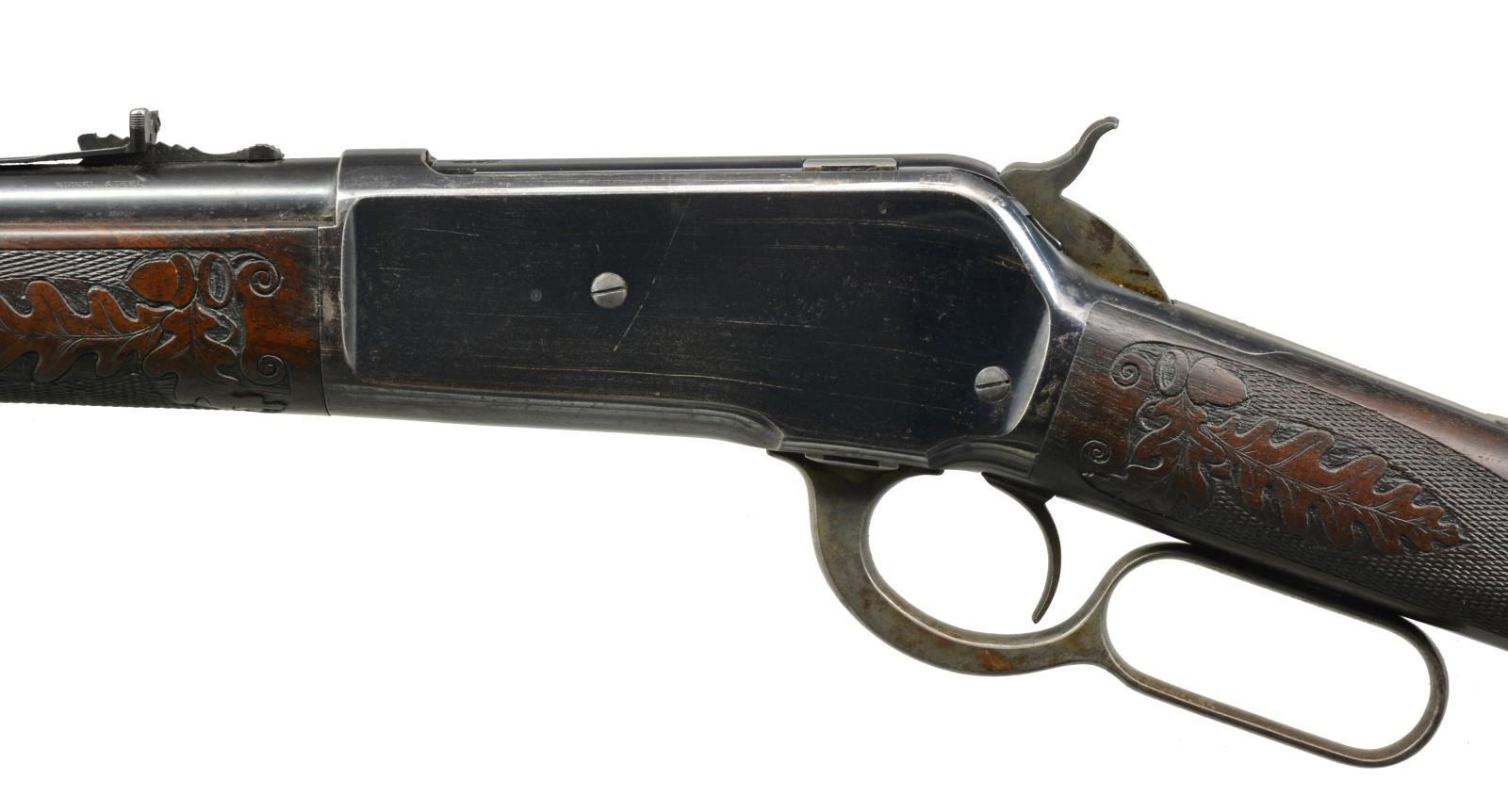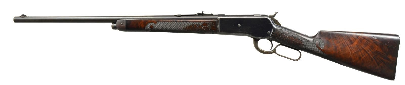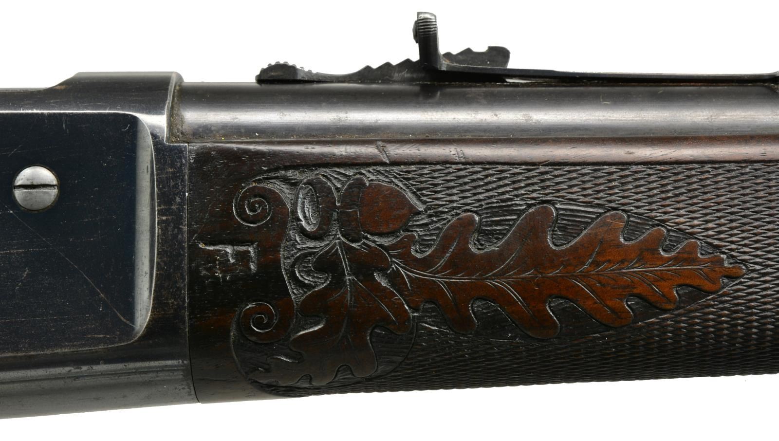 LIGHTWEIGHT LEVER ACTION RIFLE. Cal. 45-70. S# 109097. Consignor research indicates that this may be the only known non engraved M1886 rifle with style D factory carving. Bbl. 22" extra light Nickel Steel with ramp mounted Lyman No. 4 ivory hunting front sight with flat top sporting rear sight. Blue finish with case colored hammer and lever. Forearm and straight grip stock of fancy black walnut with hard rubber shotgun buttplate. Stock and forearm have Style D factory carving consisting of fancy borderless hand checkering with delicate hand carved oak leaf and acorn panels. Left side of forearm ahead of action has hand carved letter "F". Inside of top tang w/ assembly # "55". This level of carving is generally seen only on factory engraved rifles. Non engraved rifles with factory carving are exceedingly rare and very very seldom encountered. UNATTACHED ACCESSORIES: Cody Firearms Museum letter stating the following information: "Serial number applied on April 25, 1896. / Type: Rifle / Caliber: 45/70 / Barrel Type: Round / Barrel Length: 22 inches / Extra Light / Nickel Steel / Trigger: Plain / 1/2 Magazine / Fancy / Shotgun butt, Rubber butt plate / Oil Finish / Carved style D / Received in warehouse on January 20, 1902 / Shipped from warehouse on January 21, 1902, Order number 129022". CONDITION: bbl. has 80% dull lightly faded blue showing spots of light corrosion. Action retains 80% bright blue showing edge wear, light scratches with spots of surface corrosion. Hammer and lever retain 40% light and fading case colors mixing with spots of surface corrosion. Original wood finish shows moderate wear with scattered scratches and marks. Checkering and carving on stock and forearm show very light wear with a few flattened diamonds. Buttplate shows small chips around toe area. Smooth sound mechanics. Bore is bright with very good rifling. (01-17953/DS). ANTIQUE. $10,000-15,000.