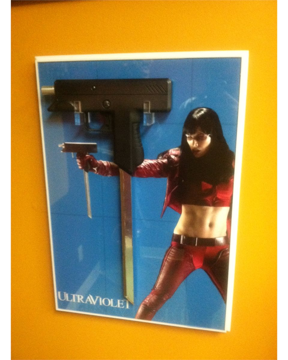 Offered here is the screen used gun used by Mila Jovovich in the Sci/Fi hit ULTRA VIOLET(Screen Gems, 2006)! Nicely displayed in an open frame so you can grab it if you like. This display alone was hundreds to design and make.