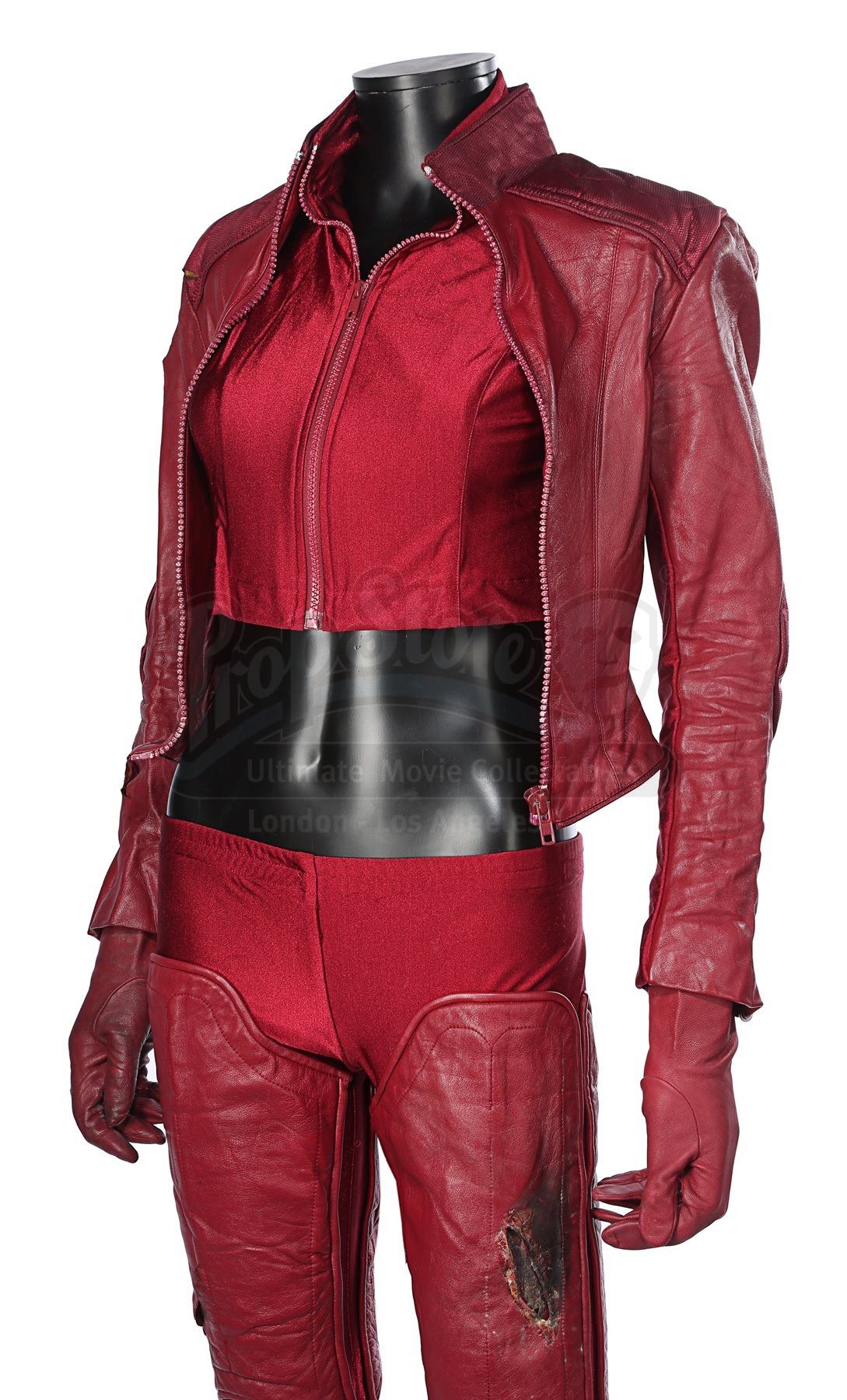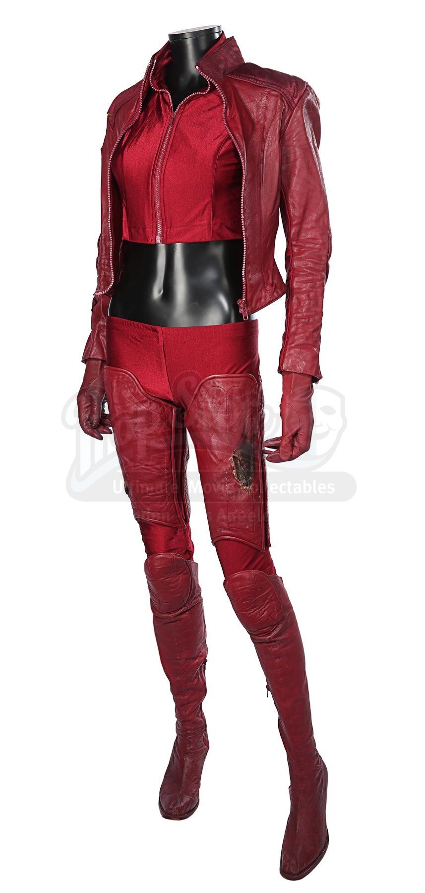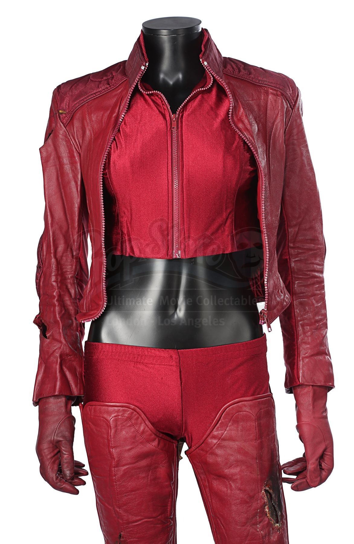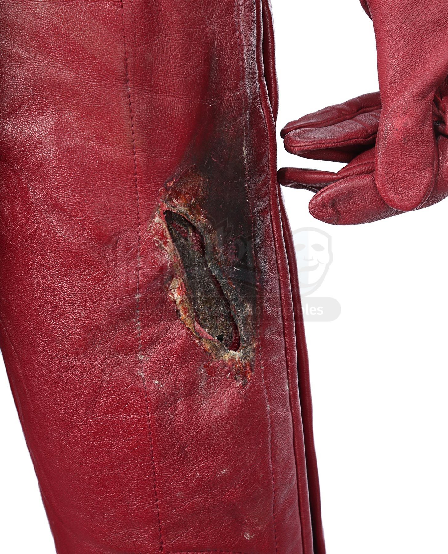 The red costume consists of a leather jacket, a Lycra zip-up top, a pair of trousers with decorative leather panels, gloves, and knee-high heeled boots. Sections of nylon and satin-like fabric have been incorporated into the jacket, with four plastic poppers adhered to the inside of the collar and outside of the top. The inside of the jacket and waistband are labelled “M” for Milla, the boots display the letter “Y” and the gloves feature the text “Y Double” for Youlia Galenko, Jovovich’s stunt double. The costume displays multiple marks and has been intentionally distressed, with paint applied to produce a burnt appearance.