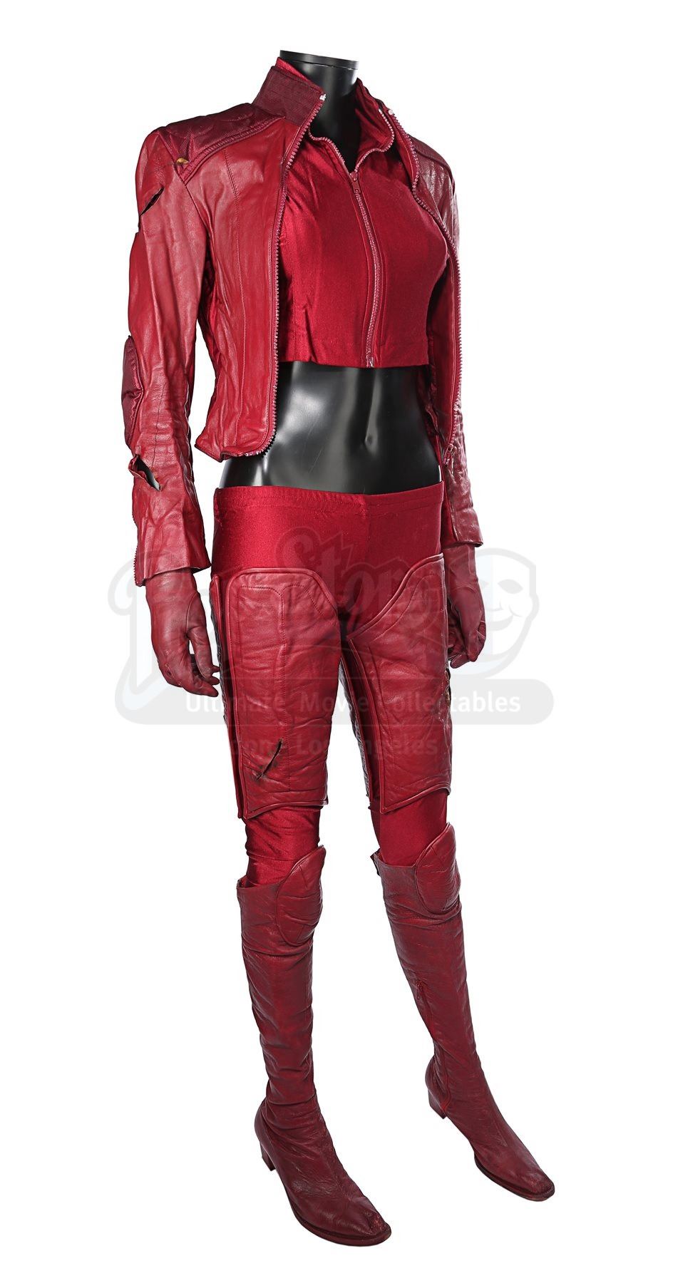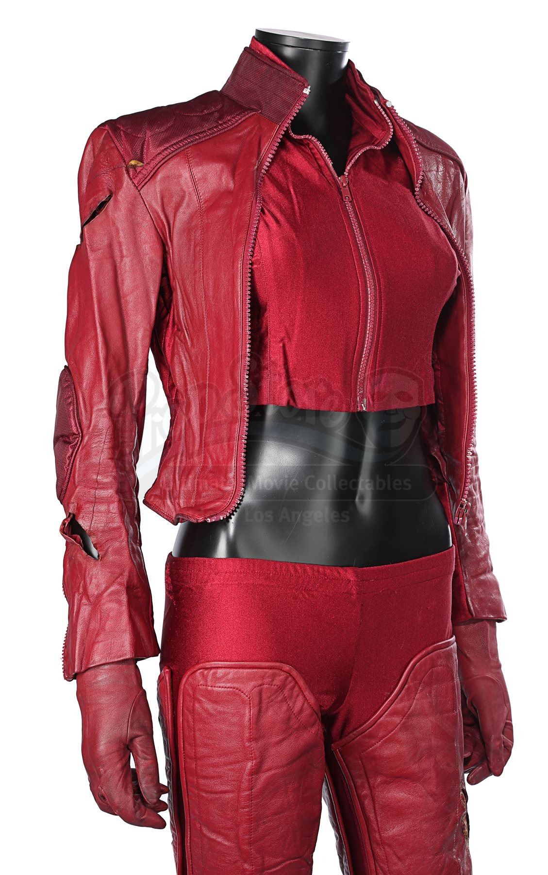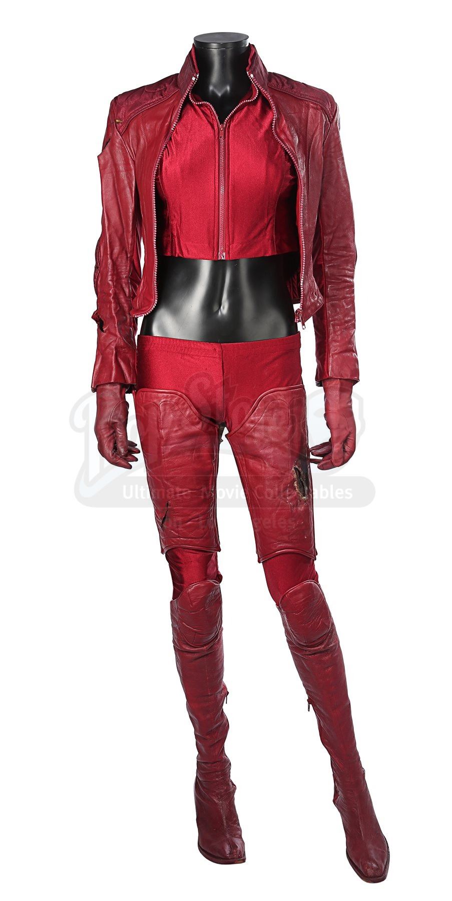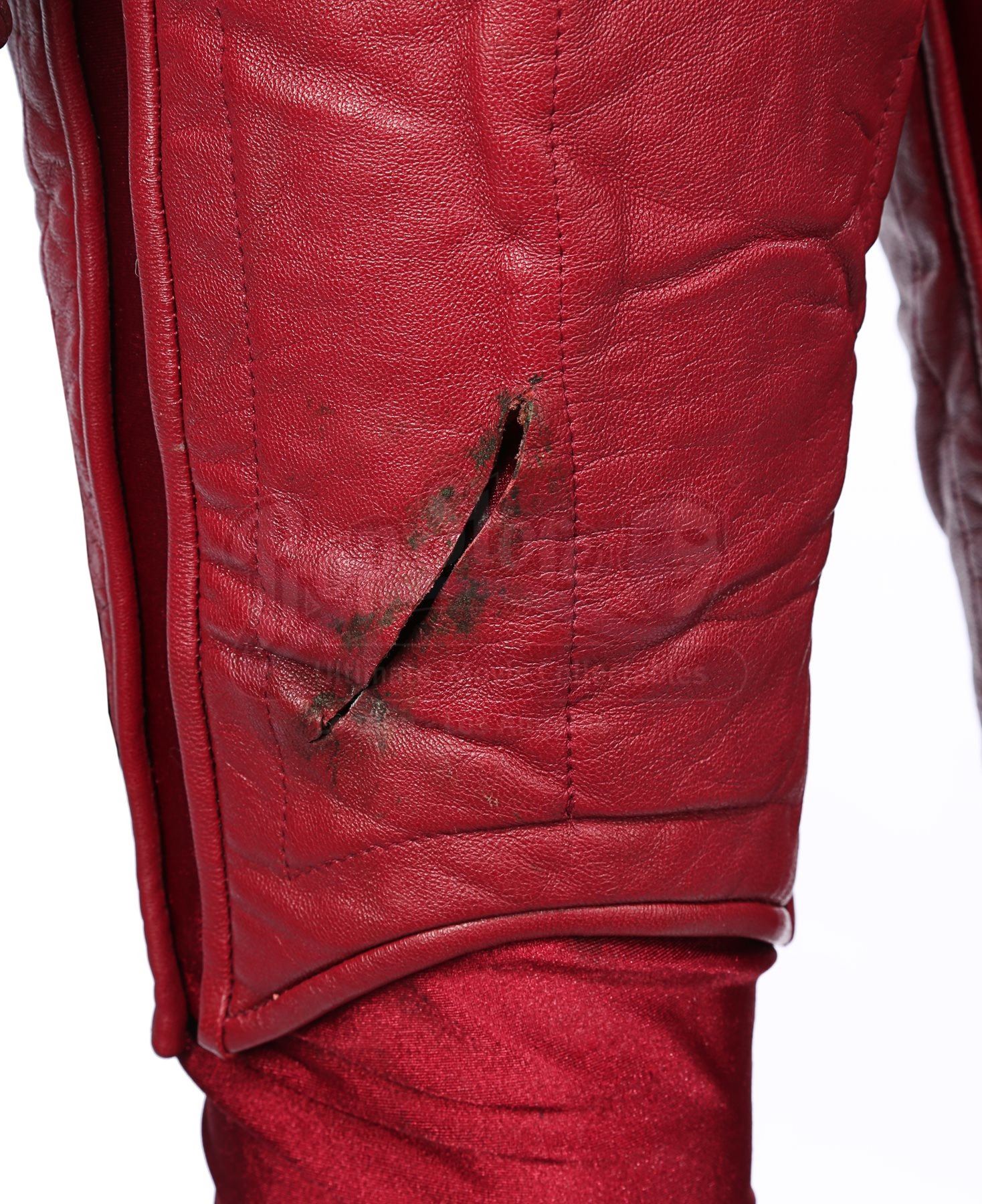 The red costume consists of a leather jacket, a Lycra zip-up top, a pair of trousers with decorative leather panels, gloves, and knee-high heeled boots. Sections of nylon and satin-like fabric have been incorporated into the jacket, with four plastic poppers adhered to the inside of the collar and outside of the top. The inside of the jacket and waistband are labelled “M” for Milla, the boots display the letter “Y” and the gloves feature the text “Y Double” for Youlia Galenko, Jovovich’s stunt double. The costume displays multiple marks and has been intentionally distressed, with paint applied to produce a burnt appearance.