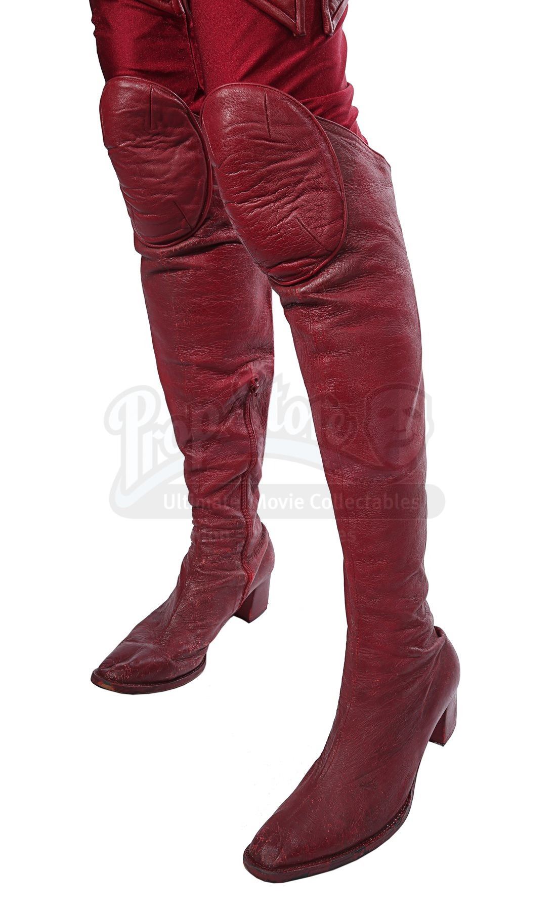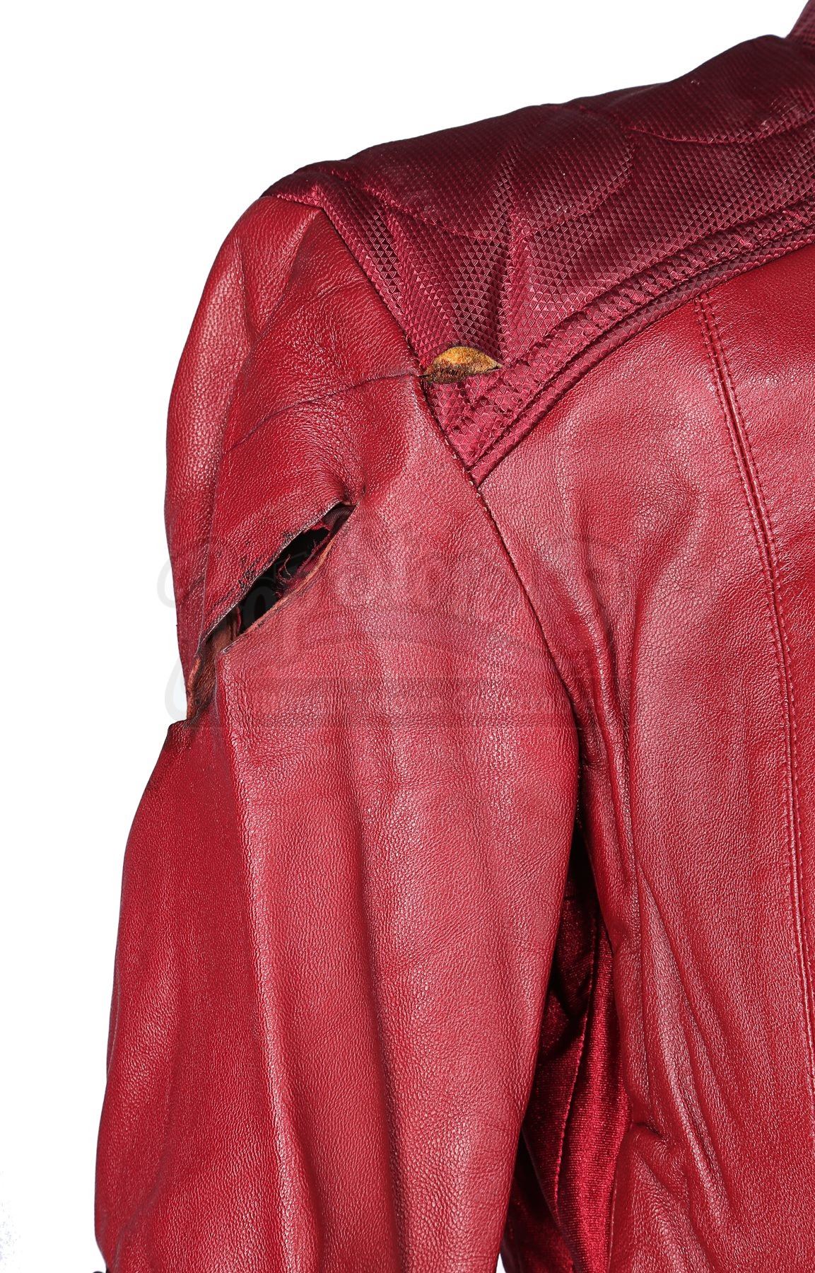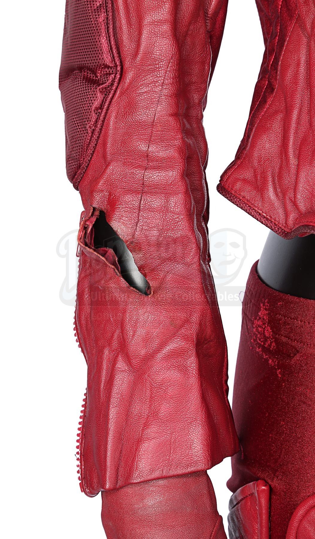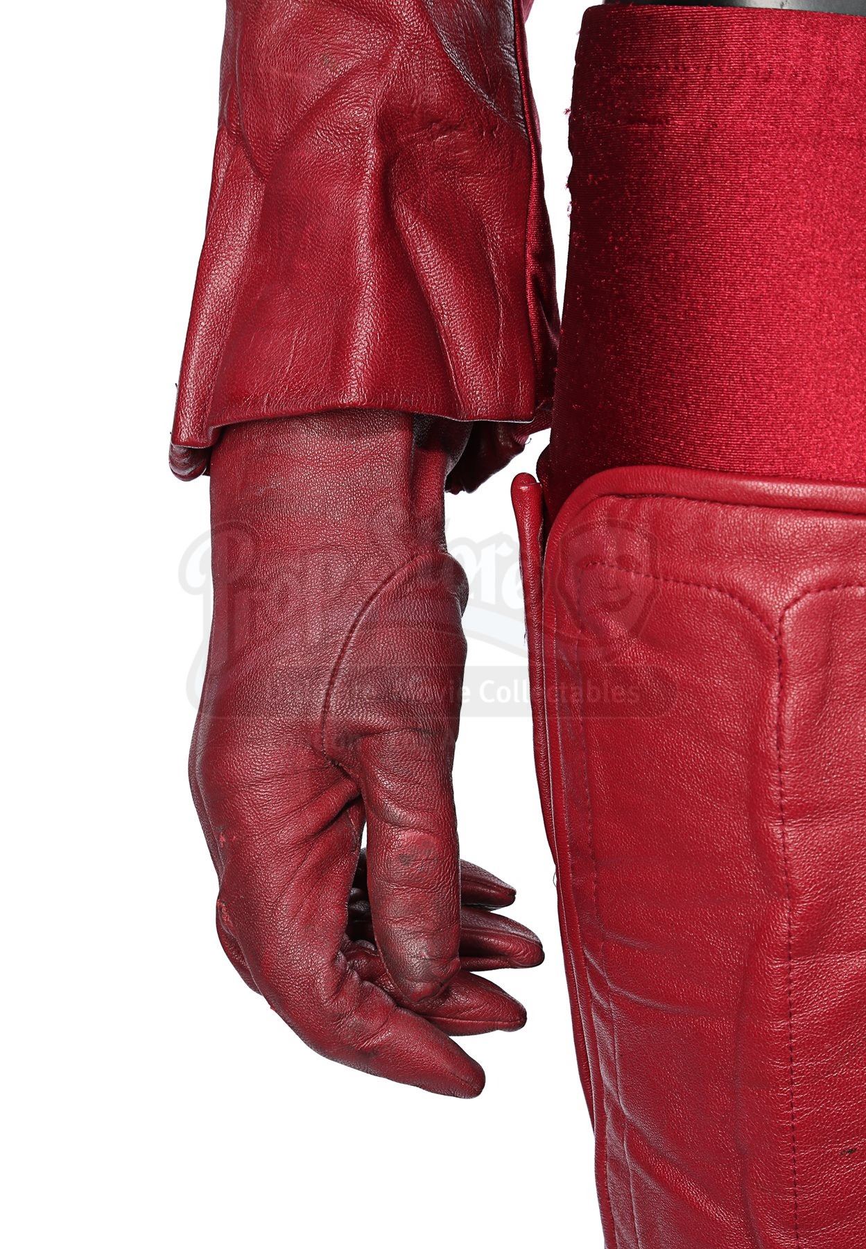 The red costume consists of a leather jacket, a Lycra zip-up top, a pair of trousers with decorative leather panels, gloves, and knee-high heeled boots. Sections of nylon and satin-like fabric have been incorporated into the jacket, with four plastic poppers adhered to the inside of the collar and outside of the top. The inside of the jacket and waistband are labelled “M” for Milla, the boots display the letter “Y” and the gloves feature the text “Y Double” for Youlia Galenko, Jovovich’s stunt double. The costume displays multiple marks and has been intentionally distressed, with paint applied to produce a burnt appearance.