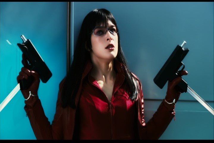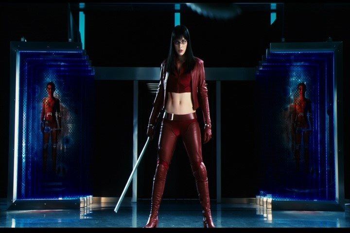 Violet’s (Milla Jovovich) end-scene costume from Kurt Wimmer’s sci-fi action film Ultraviolet. Violet wore her costume when she fought off numerous guards to rescue Six (Cameron Bright) and battled Daxus (Nick Chinlund).