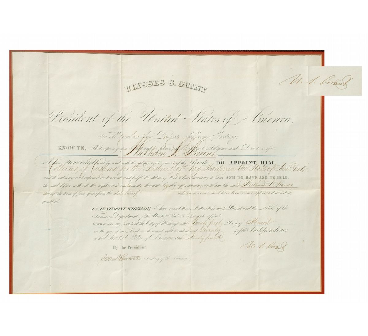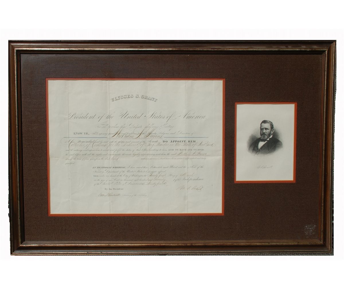 18th President, Document Signed. Washington: 21 March 1870. Vellum document appointing Wickham Havens collector of customs for Sag Harbor, New York. 14 x 18 inches (36 x 46.5); framed with a portrait. Folds with one short split, tipped to mount at header, lightly offset.