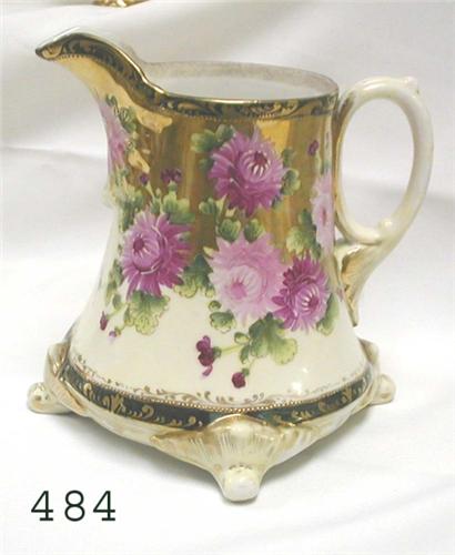 UM footed milk pitcher with rose decoration and heavy gold background – some wear