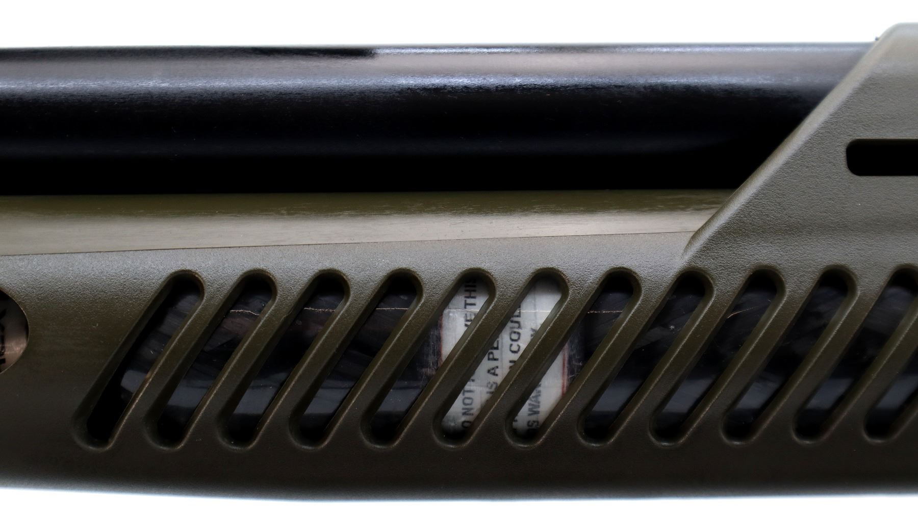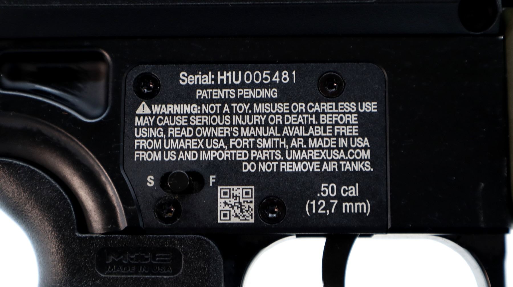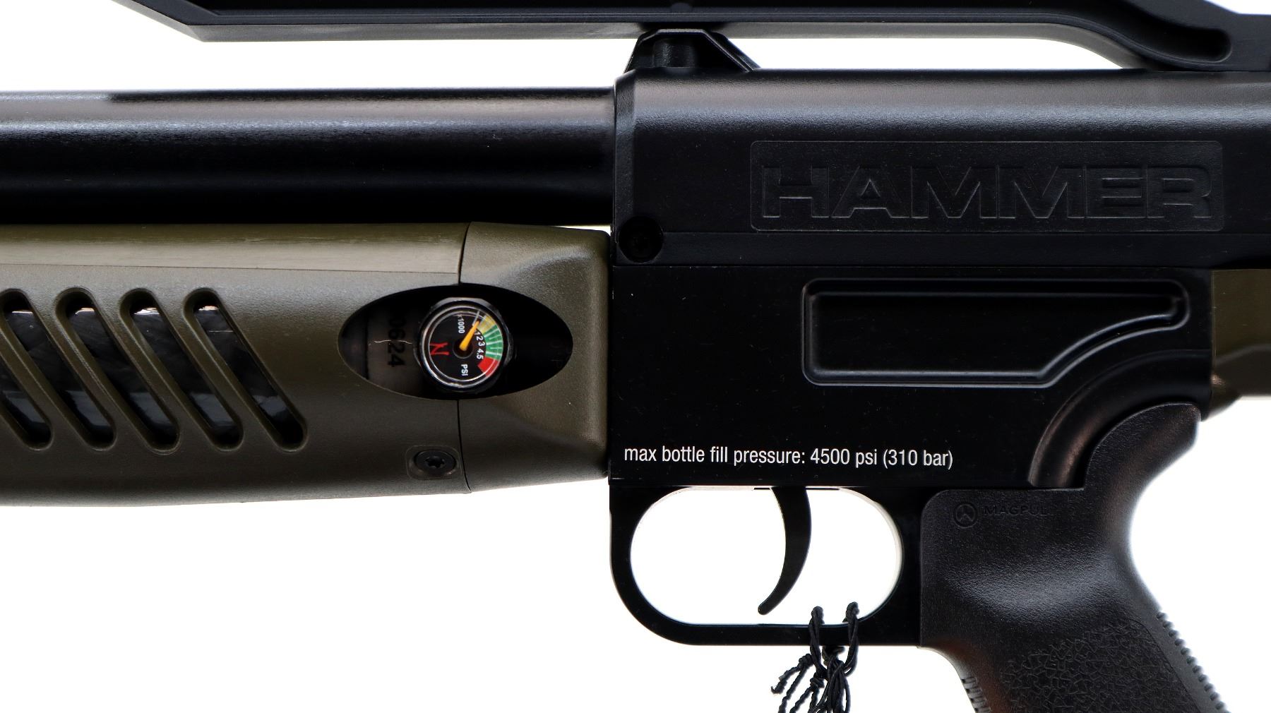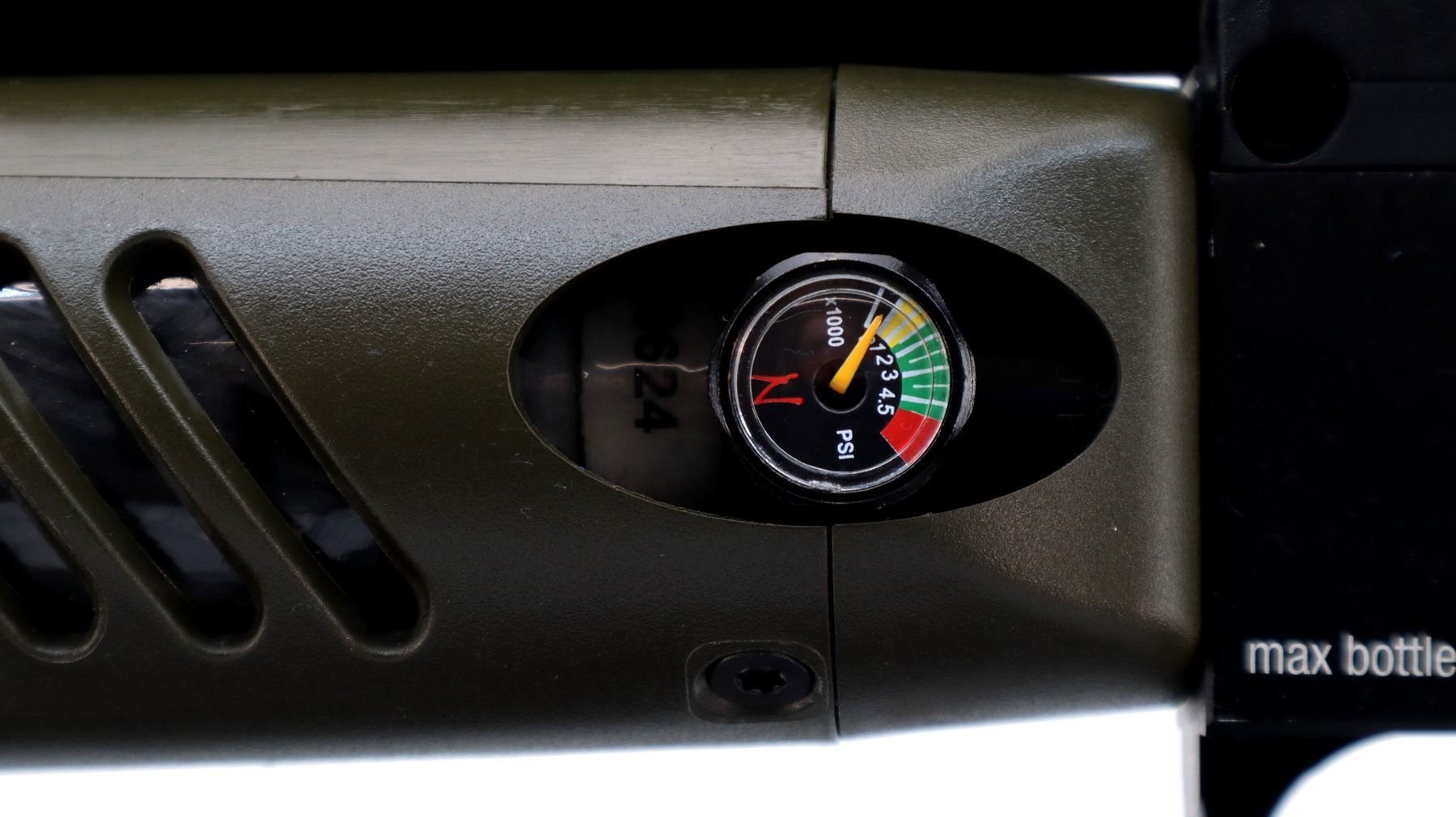 Main Description: This is an air powered bolt action two round magazine .50 cal rifle using compressed air, advertised as 705 FT-LBS energy depending on projectile, 3000 PSI regulator with three full power regulated shots. No sights, shrouded round barrel, black polymer receiver with full length rail, smooth cocking handle. Two piece ODG polymer furniture, ventilated forearm with Carbon fiber wrapped air bottle, pressure gauge on left side, textured MagPul MOE grip, black polymer comb, textured black rubber recoil pad, retains factory hang tags.