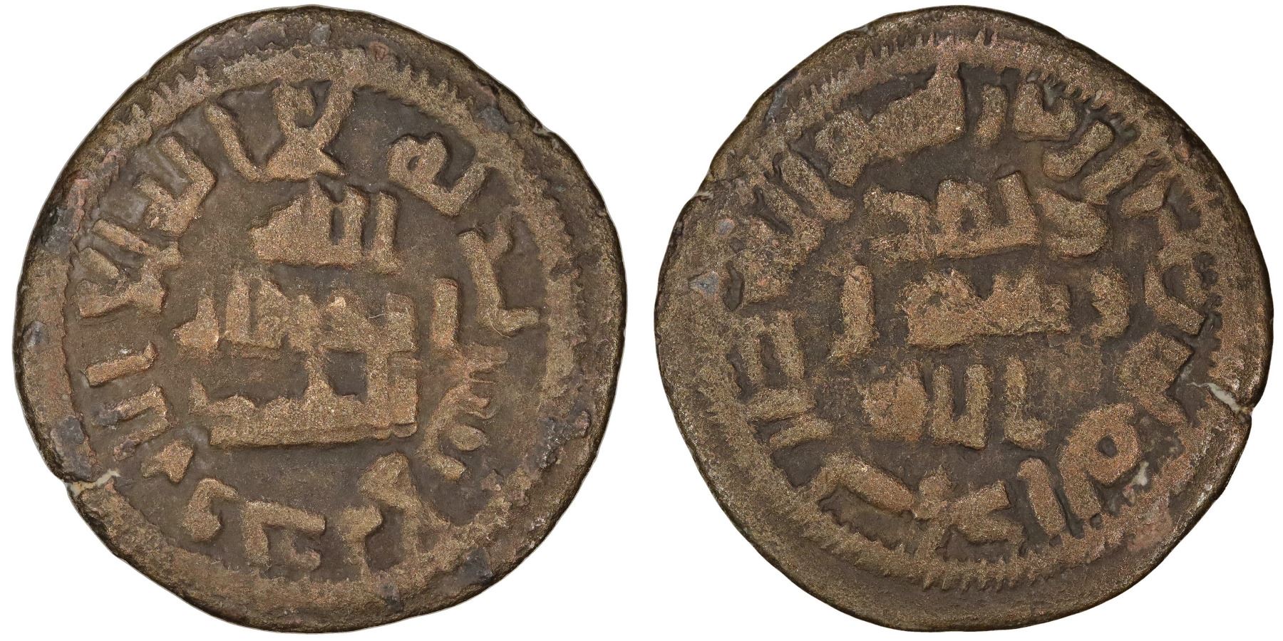 UMAYYAD: bronze fals (2.89g), Harran mint. Mint name followed by word "jaz" ("passed"), pointing to its production under legal authority. W-786. Fine. Scarce.