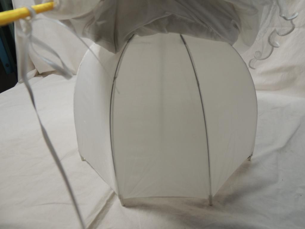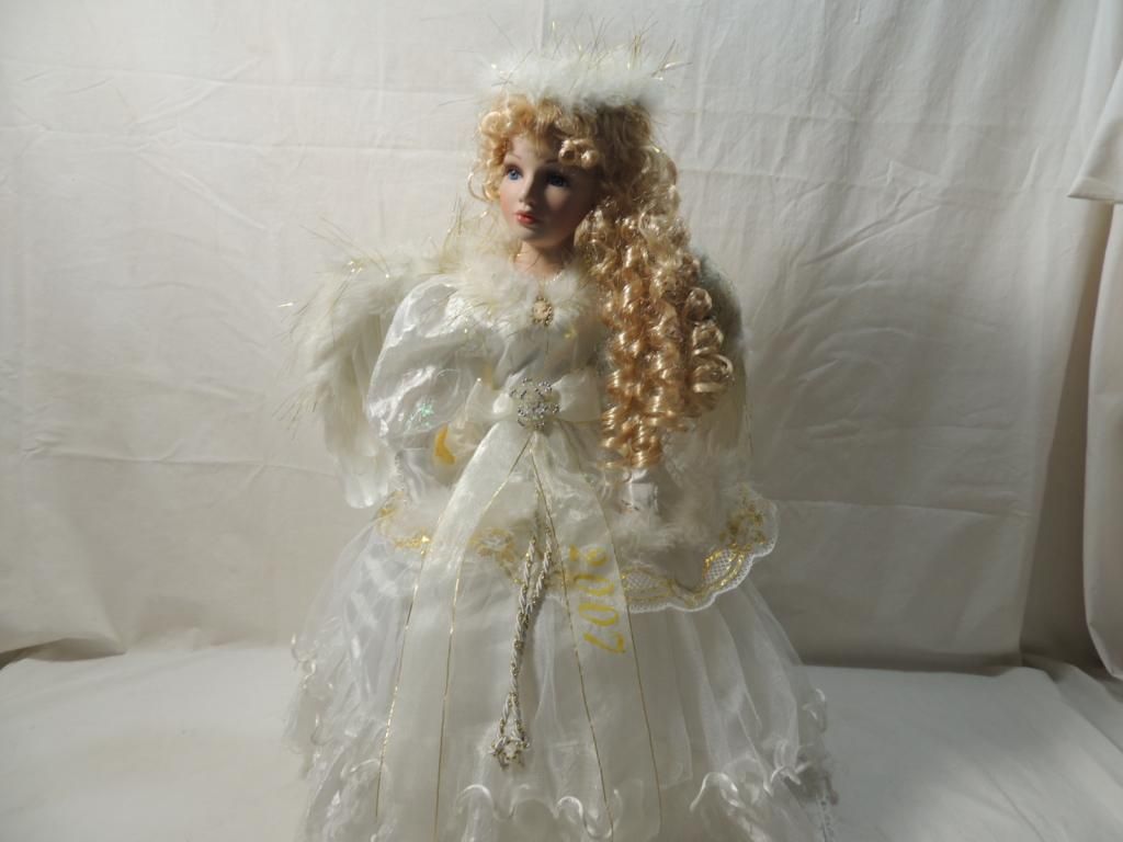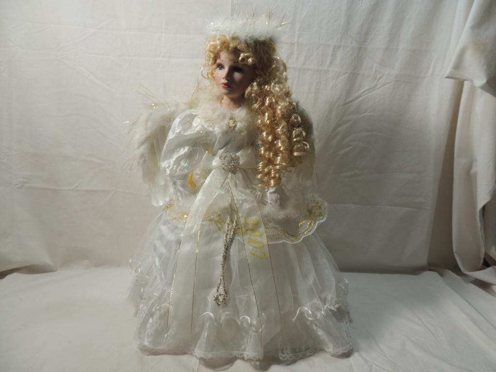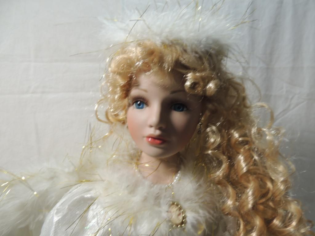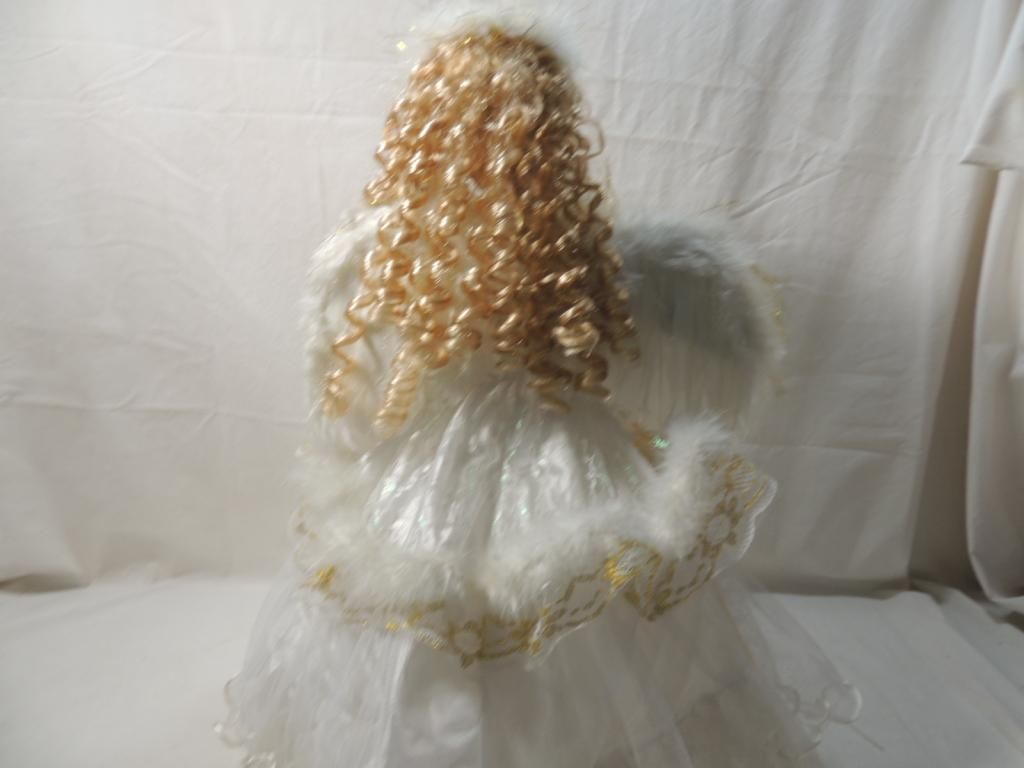 Umbrella Bottom Angel Porcelain Doll 30" WITH WINGS. A LOVELY HIGH FASHION LADY DRESSED IN WHITE AND GOLD DRESS WITH LACE AND FREATHER WINGS. BLONDE HAIR WITH RINGLET CURLS. BLUE EYES. WAND. AS SHOWN. SEE PHOTO FOR MORE DETAILS. VERY PRETTY. AS SHOWN.