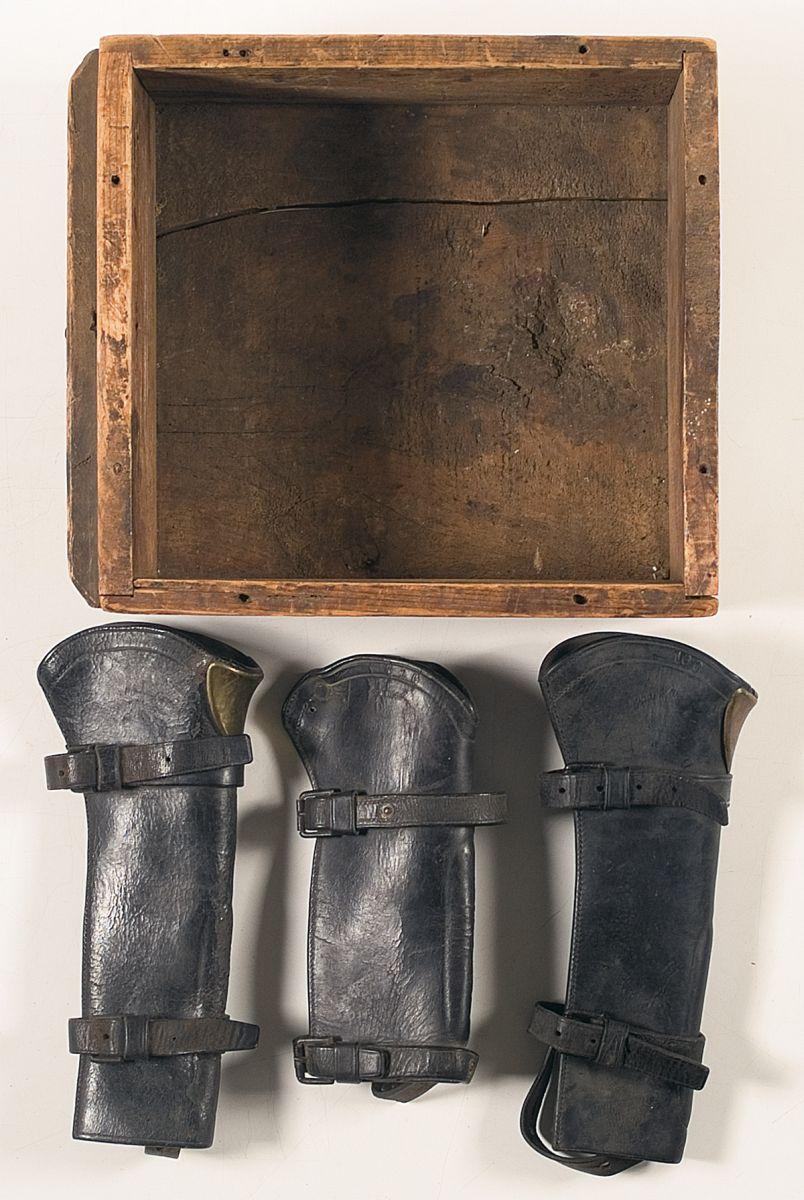UMC crate for 1000 rounds .45-55 carbine cartridges. Crate has UMC markings on two of the sides with the date "MAY 29, 05", contemporary "SPRING VISES" marked on a side and Frankford Arsenal markings on the bottom. About good, side with a UMC marking has some cracks and bottom cracked, but remains solid. With Rock Island Arsenal marked 3 carbine boots with one also marked "Co. I 8th CAV" (fair to good).