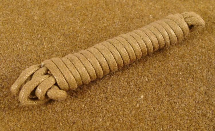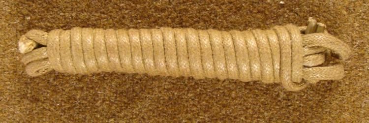 HERE IS AN ORIGINAL UN-ISSUED NAZI STEEL POT HELMET LEATHER LINER TIE-CORD. THIS NAZI COMBAT HELMET CORD WAS FOR THE INNER LEATHER LINER. IT IS IN MINT MANUFACTURED TIED CONDITION. *