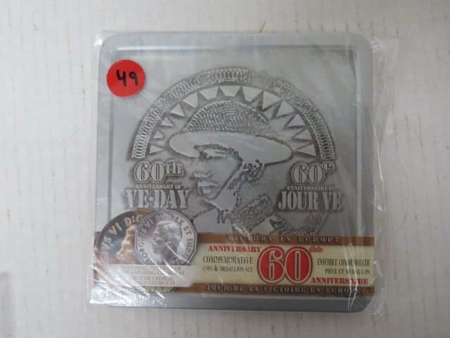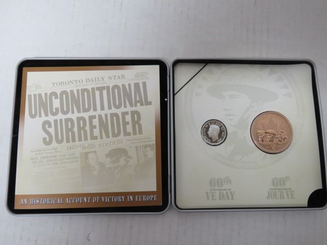 UN-OPENED, VE DAY 60TH ANNIVERSARY COMMERATIVE COIN & MEDALLION SET FEATURING PORTRAIT OF THE LATE KING GEORGE VI