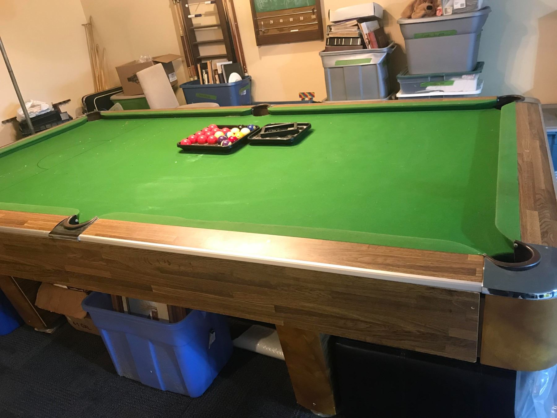 UNASSEMBLED LARGE POOL TABLE WITH BALLS, CUES, ETC