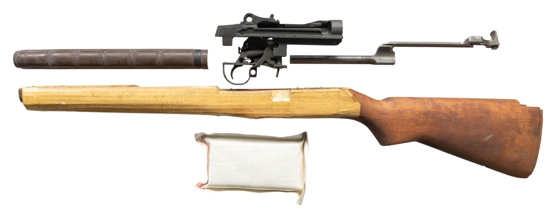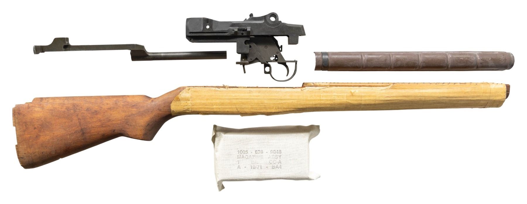 STOCK, & PARTS. Cal. 7.62mm. S# 1002124. An unassembled Smith Enterprises M14 NM receiver. Gray parkerized finish. Unfinished, hardwood shoulder stock. Brown plastic heat shield. "HR" marked trigger group. Op-rod. MAGS: 1 original 20 rd, still in cloth wrap, dated 10/71. CONDITION: unassembled. Some parts may be as new, while others may have been removed from prior rifles. (25-3162/JZ). MODERN. $600-900.