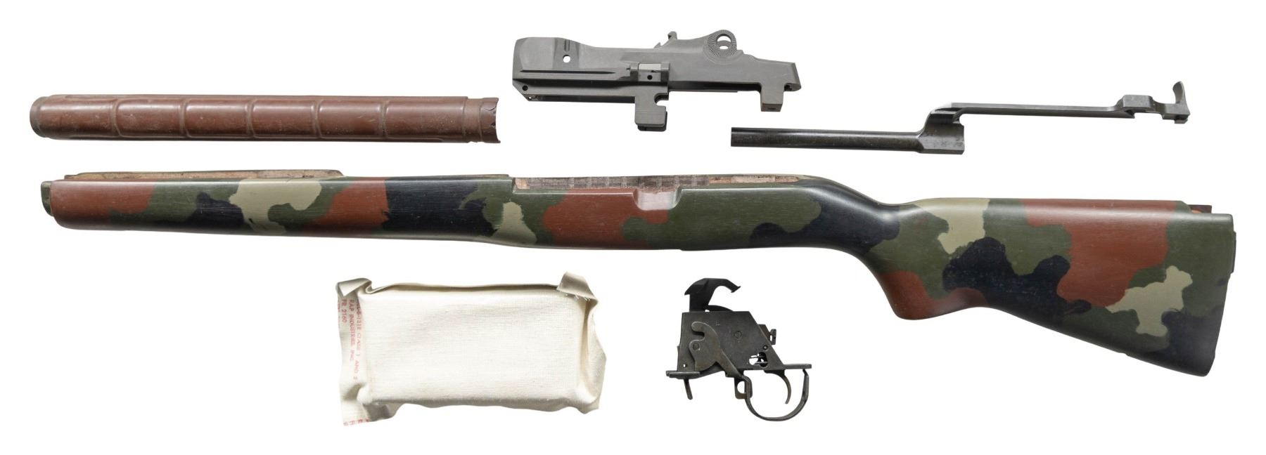 STOCK, & PARTS. Cal. 7.62mm. S# 002176. An unassembled Smith Enterprises M-21 receiver. Gray parkerized finish. Lettering has been filled in white for ease of reading. Unfinished, woodland camo M25 style shoulder stock. Brown plastic heat shield. "SA" marked trigger group. Op-rod. MAGS: 1 original 20 rd, still in cloth wrap, dated 10/71. CONDITION: unassembled. Some parts may be as new, while others may have been removed from prior rifles. (25-3174/JZ). MODERN. $600-$900.