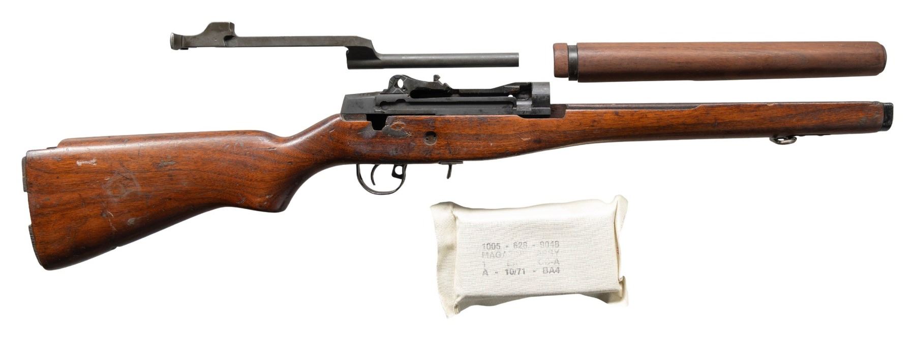 STOCK, & PARTS. Cal. 7.62mm. S# 069051. An unassembled Springfield Armory M1A receiver. Gray parkerized finish. Surplus, hardwood shoulder stock. Early, wood heat shield. "HR" marked trigger group. Op-rod. MAGS: 1 original 20 rd, still in cloth wrap, dated 10/71. CONDITION: unassembled. Some parts may be as new, while others may have been removed from prior rifles. (25-3176/JZ). MODERN. $600-$900.