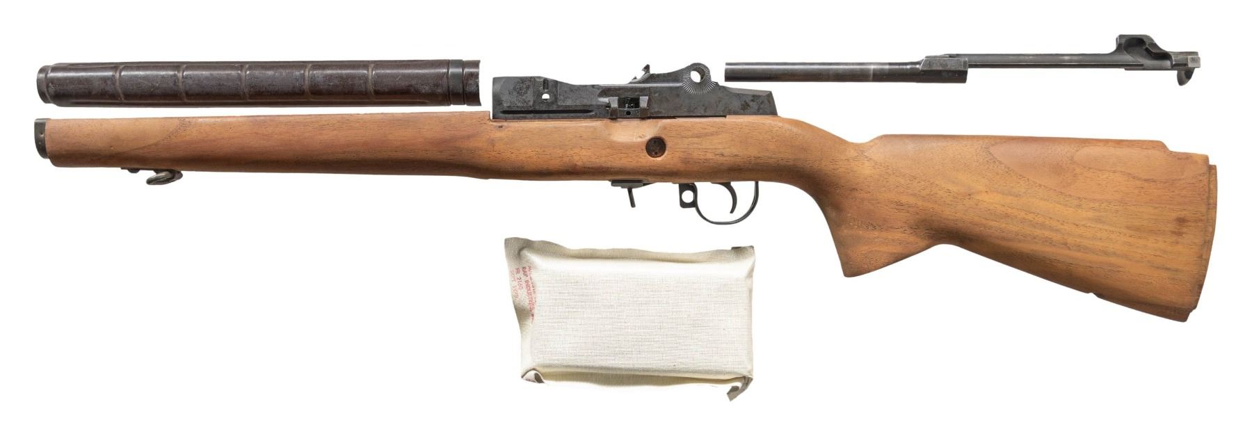 STOCK, & PARTS. Cal. 7.62mm. S# 069052. An unassembled Springfield Armory M1A receiver. Gray parkerized finish. Unfinished, hardwood shoulder stock. Brown plastic heat shield. "HR" marked trigger group. Op-rod. MAGS: 1 original 20 rd, still in cloth wrap, dated 10/71. CONDITION: unassembled. Some parts may be as new, while others may have been removed from prior rifles. (25-3168/JZ). MODERN. $600-900.