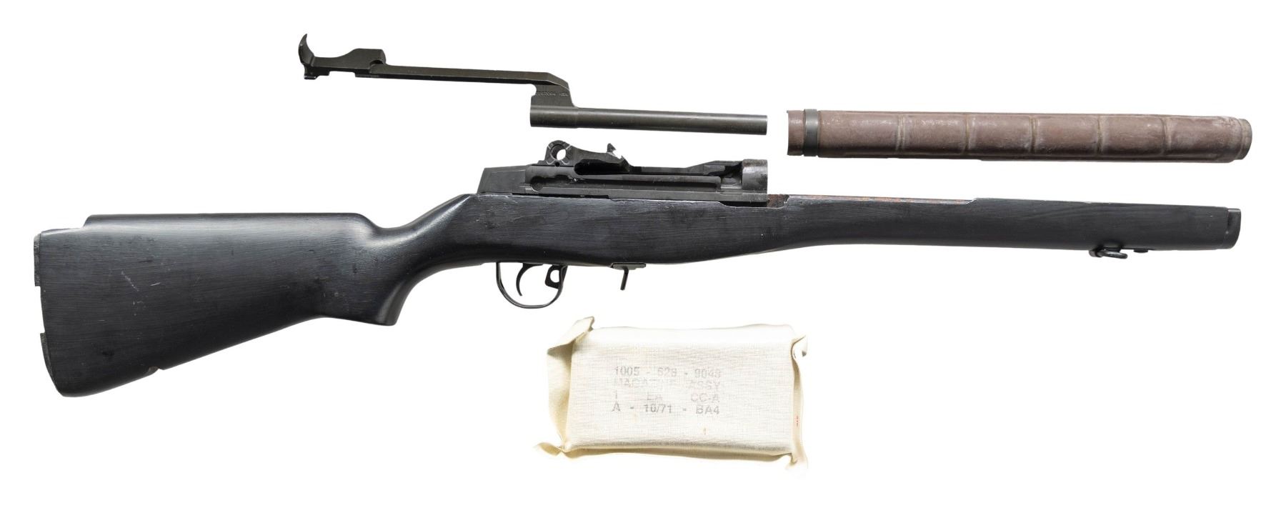 STOCK, & PARTS. Cal. 7.62mm. S# 107272. An unassembled Springfield Armory M1A receiver. Gray parkerized finish. Black painted, unfinished, hardwood shoulder stock. Brown plastic heat shield. "SA" marked trigger group. Op-rod. MAGS: 1 original 20 rd, still in cloth wrap, dated 10/71. CONDITION: unassembled. Some parts may be as new, while others may have been removed from prior rifles. (25-3171/JZ). MODERN. $600-$900.