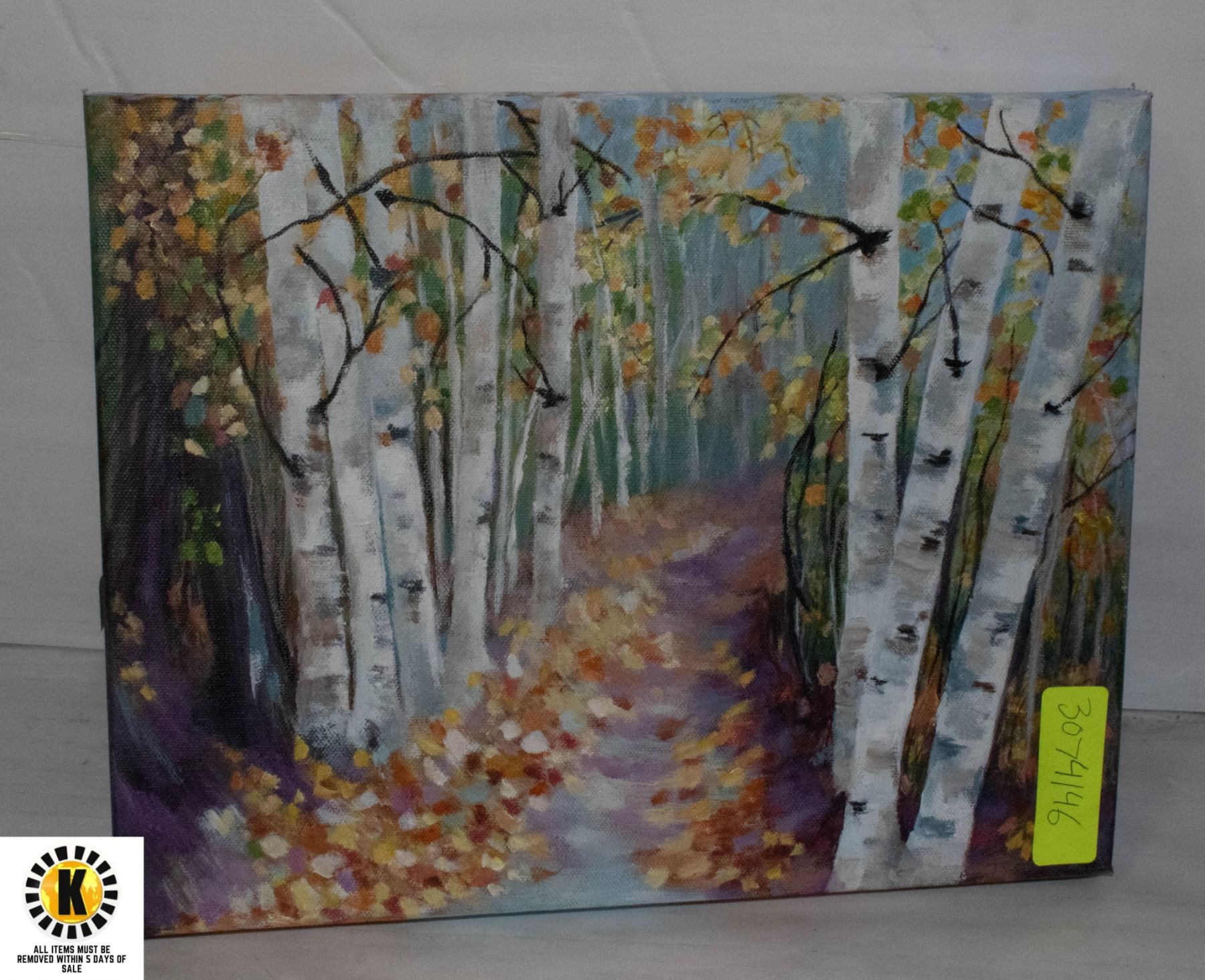 IN INK ON THE BACK, FOREST SCENE PAINTING 11" X 14"