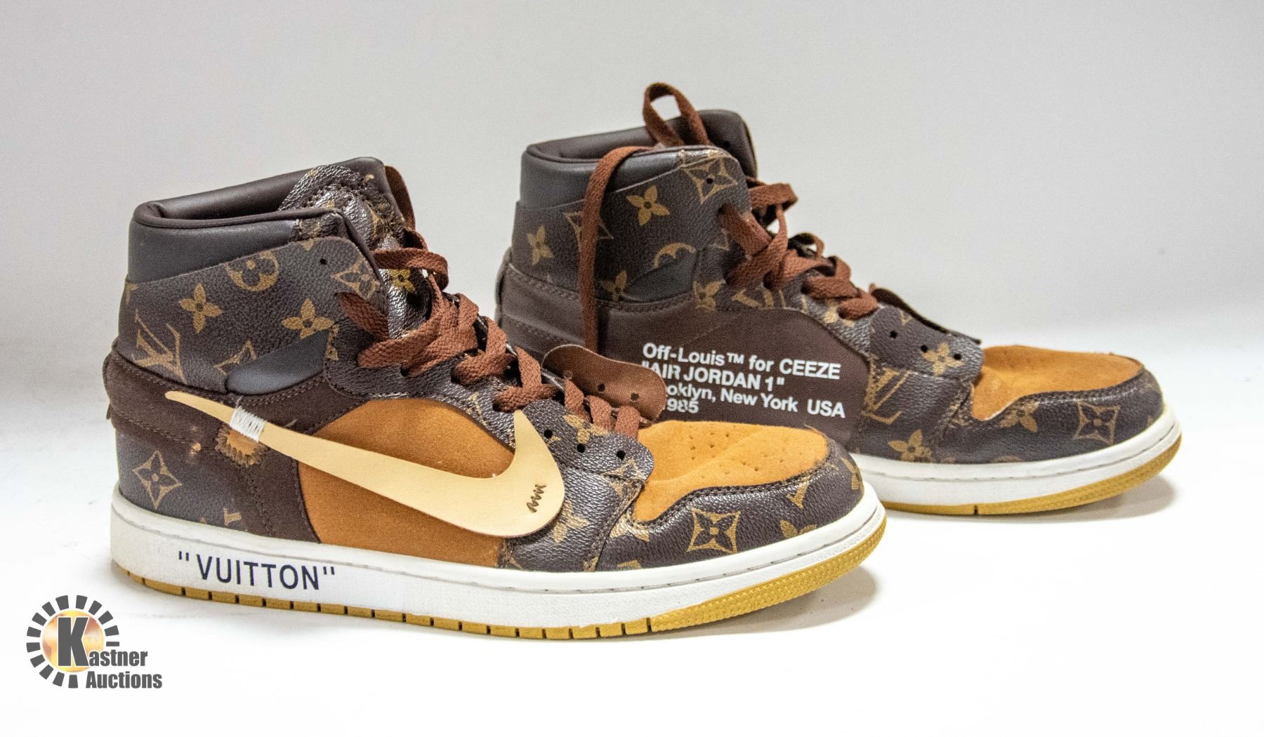 VUITTON OFF-WHITE AIR JORDAN 1 "OFF-LOUIS" NO. AQ0818-202 BROWN AND WHITE DESIGNER SNEAKERS, MEN'S SIZE 9.5 / WOMEN'S 11.5 **ALL ITEMS MUST BE REMOVED BY 5PM SATURDAY, MAY 6TH 2023. ALL REMAINING ITEMS WILL BE SUBJECT TO A $6.00 PER DAY STORAGE CHARGE. ANY ITEMS REMAINING AFTER MONDAY, MAY 22ND, 2023 WILL BE CONSIDERED FORFEITED. NO REFUNDS WILL BE ISSUED FOR FORFEITED ITEMS. TO SCHEDULE A PICK UP APPOINTMENT CLICK HERE