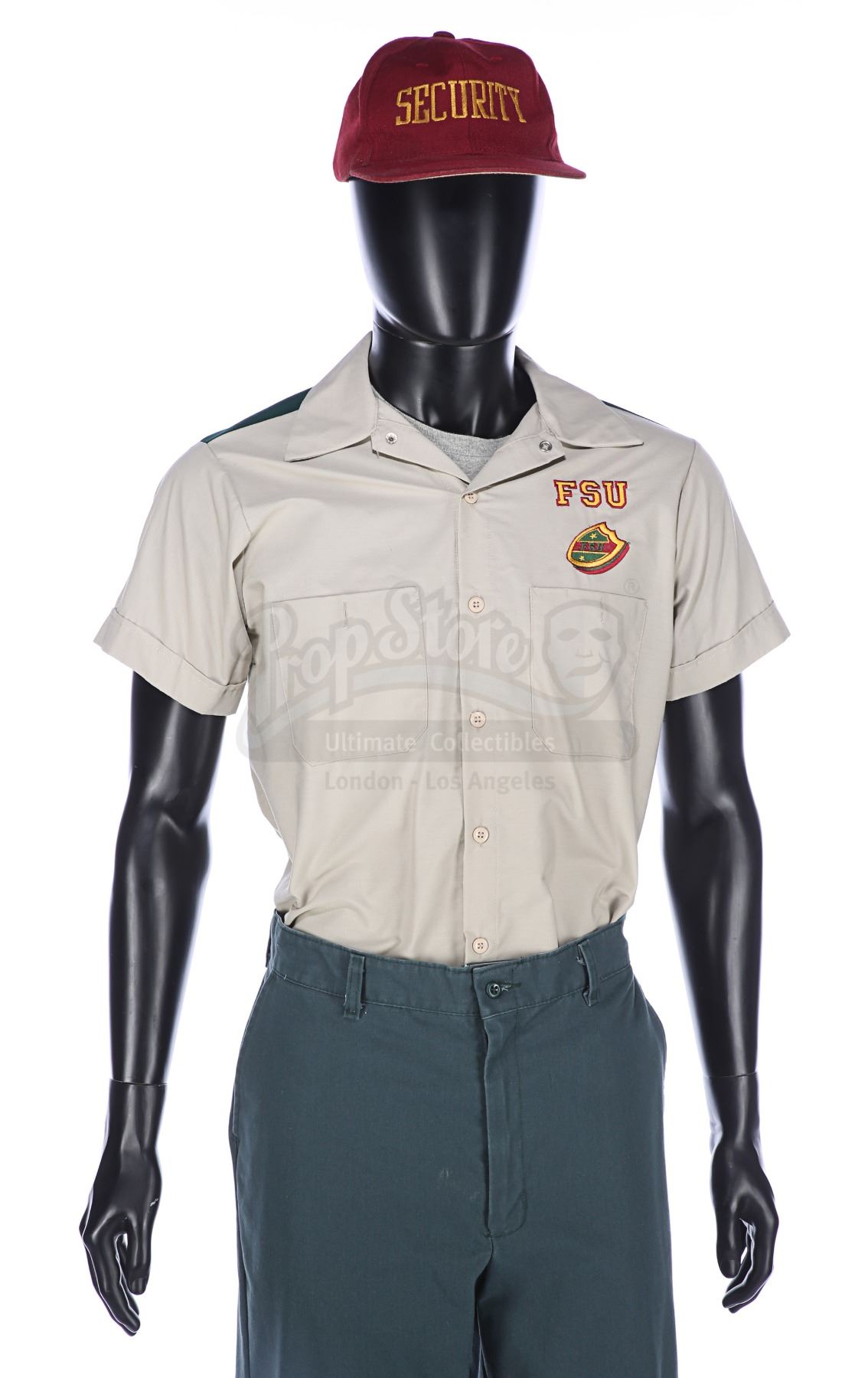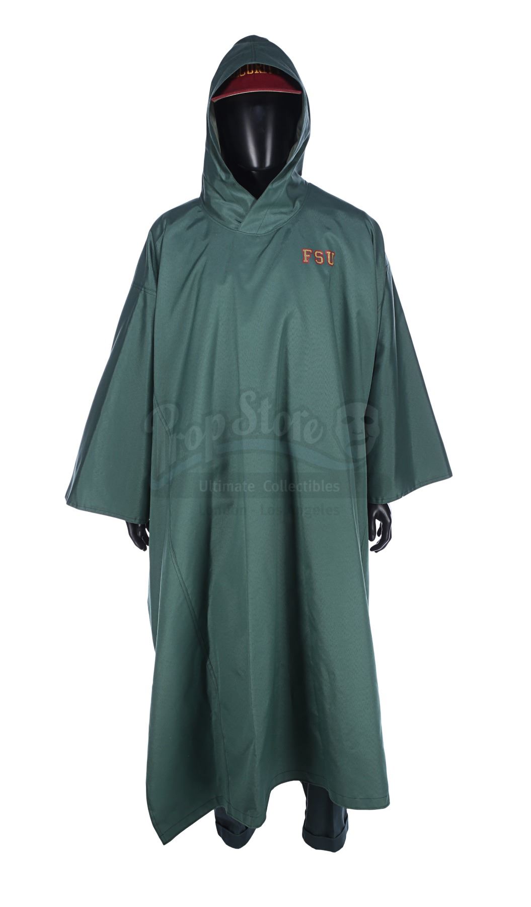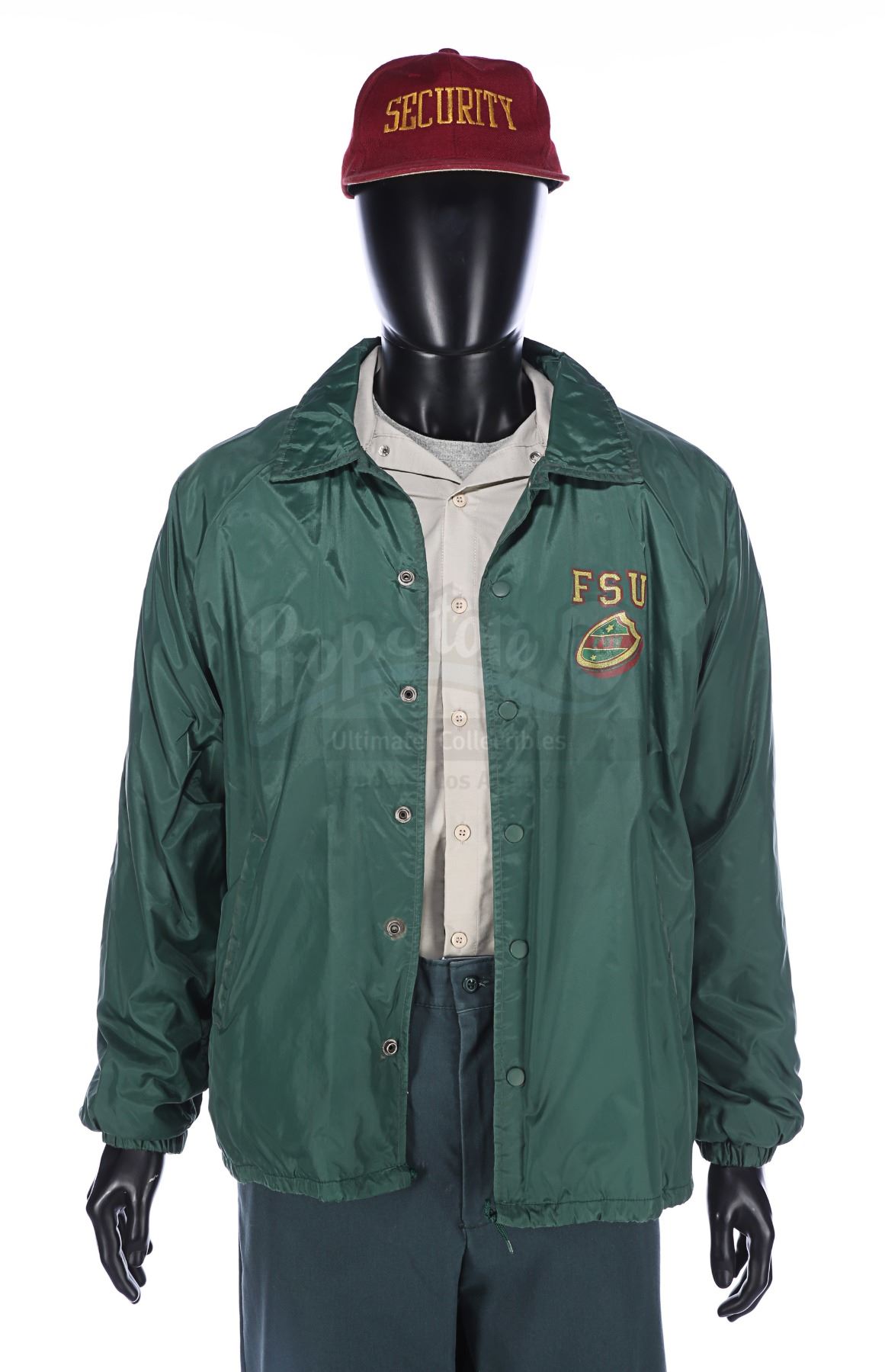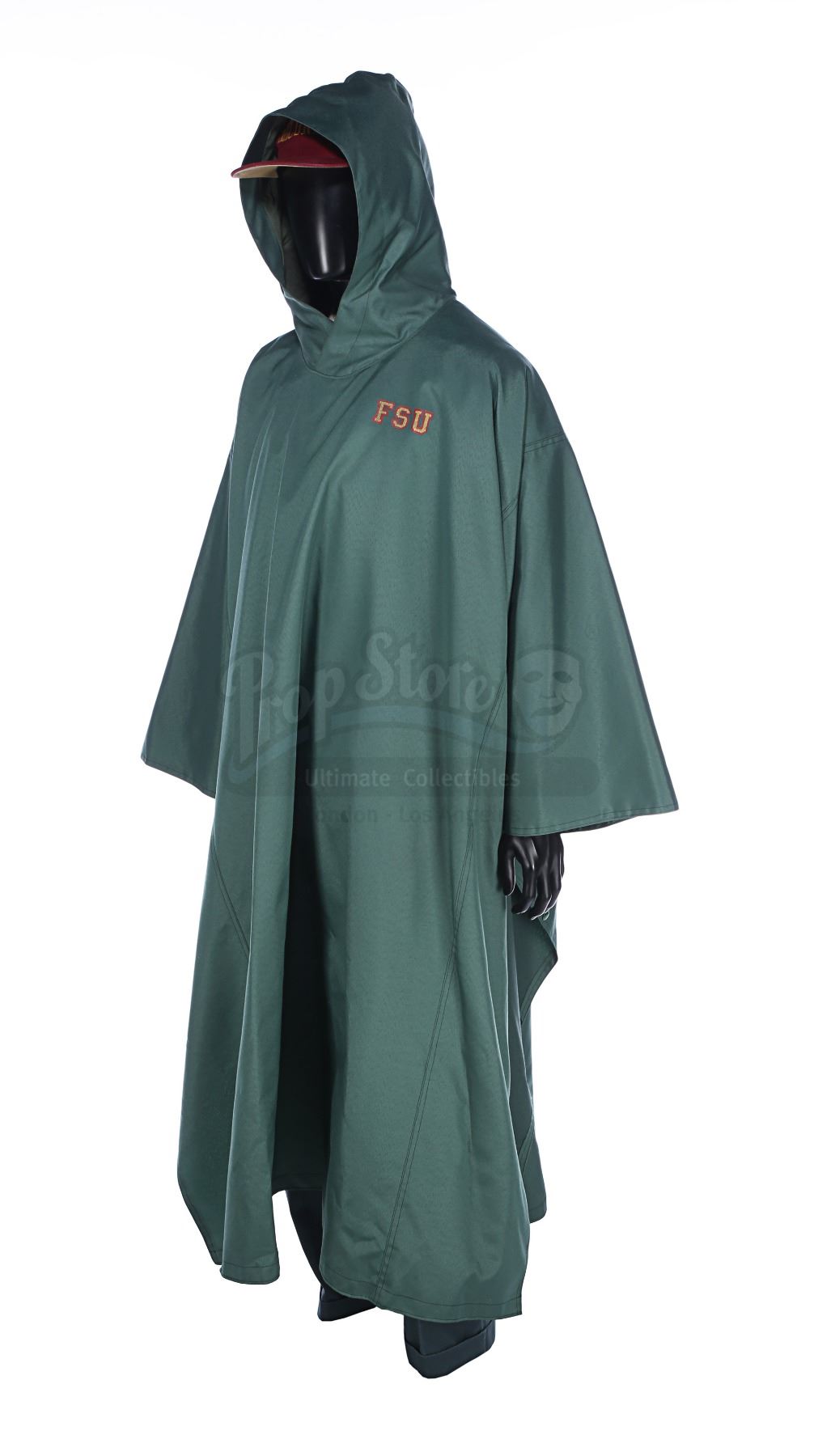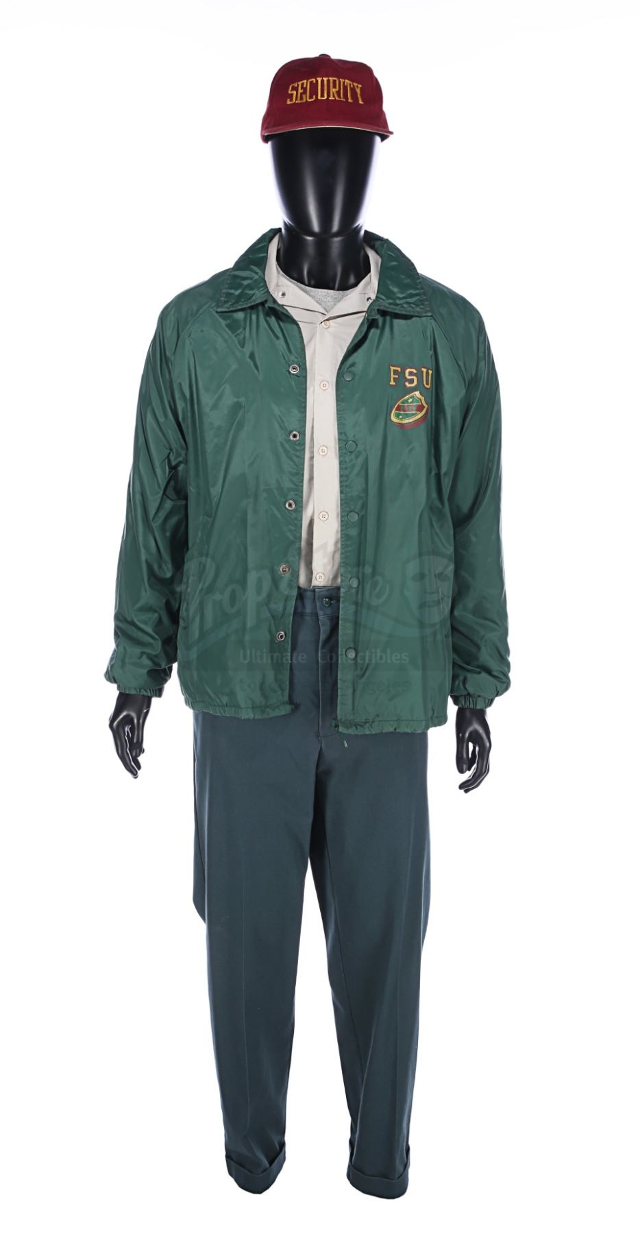 The costume comprises a red cap; a floor-length green nylon hooded rain poncho; a green nylon Auburn sportswear jacket (size L); a short-sleeved light brown polyester blend shirt; a grey Calvin Klein T-shirt (size M) and a pair of teal cotton trousers featuring turned-up hems. Three of the garments feature the letters "FSU" - an abbreviation of Franklin State University - in red and yellow, and several components display the word "Security" in yellow. The costume displays signs of production use, including staining around the inside of the jacket neckline, light marks on the trousers and trailing threads on the shirt. The ensemble comes with a letter of authenticity from a senior crew member.