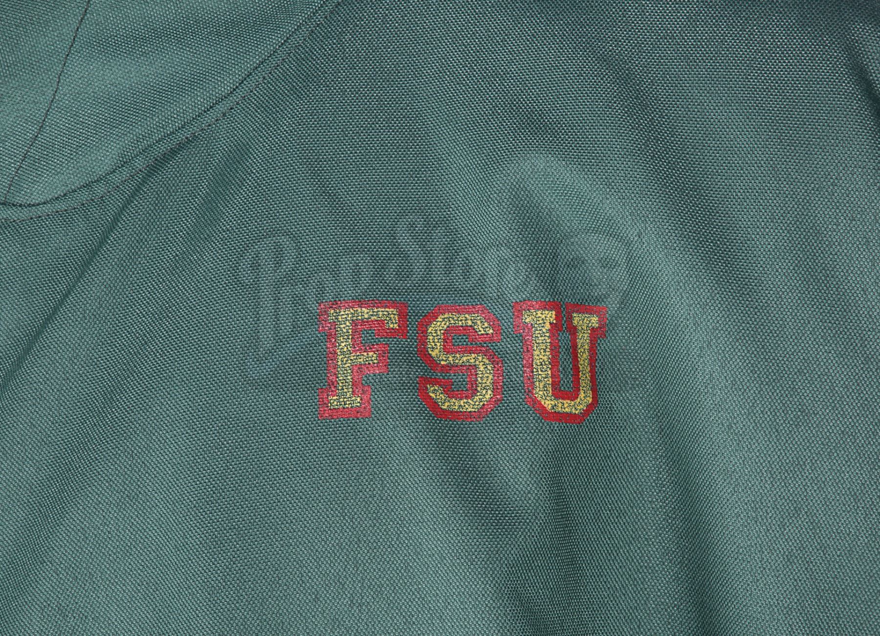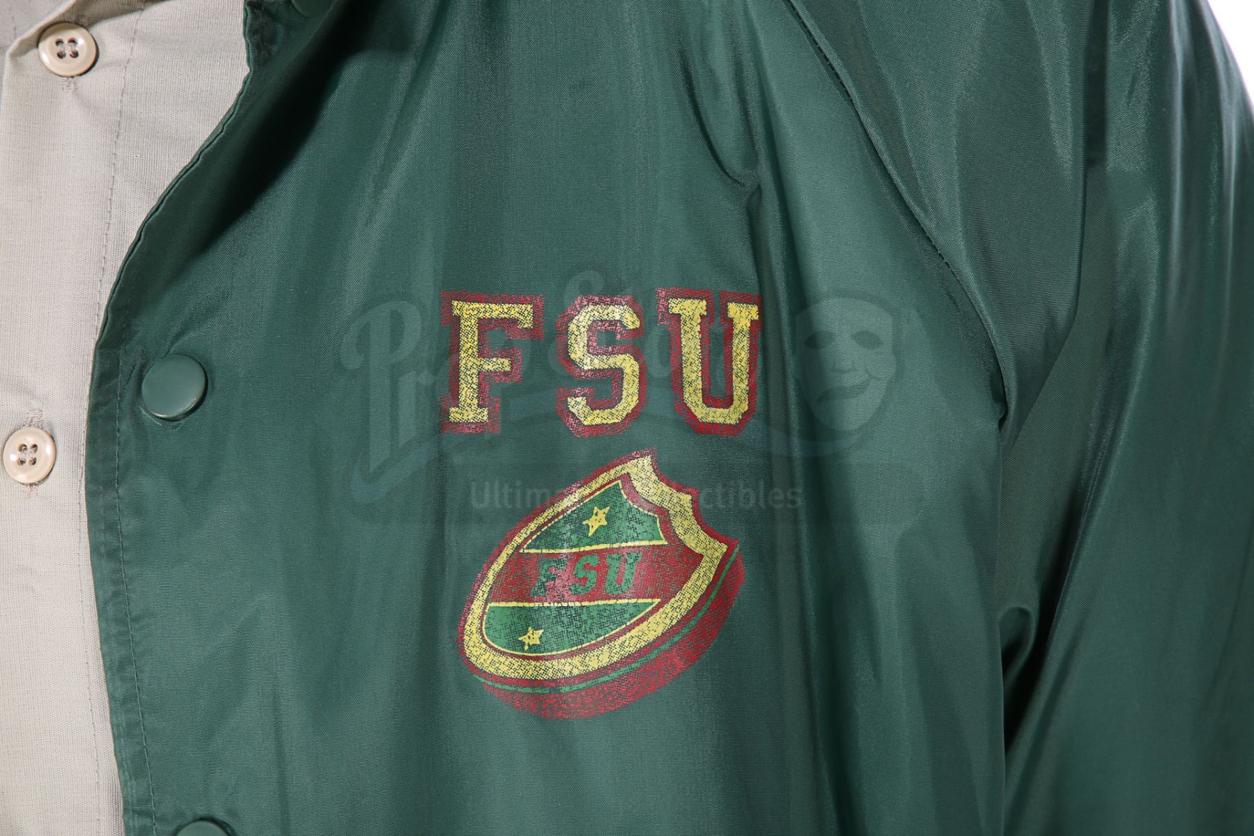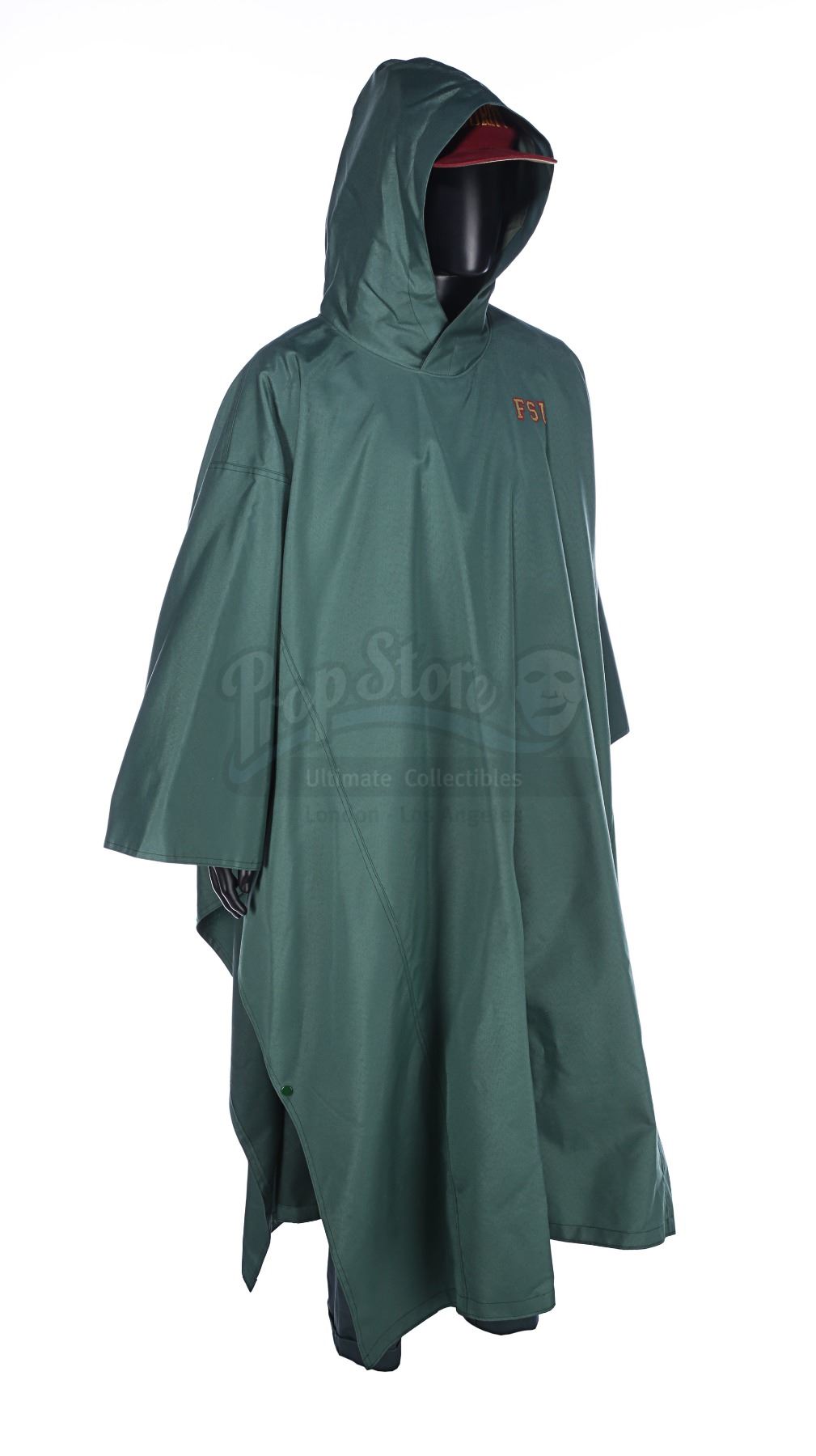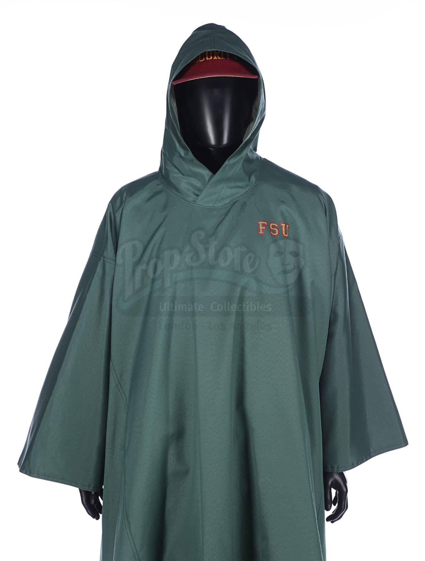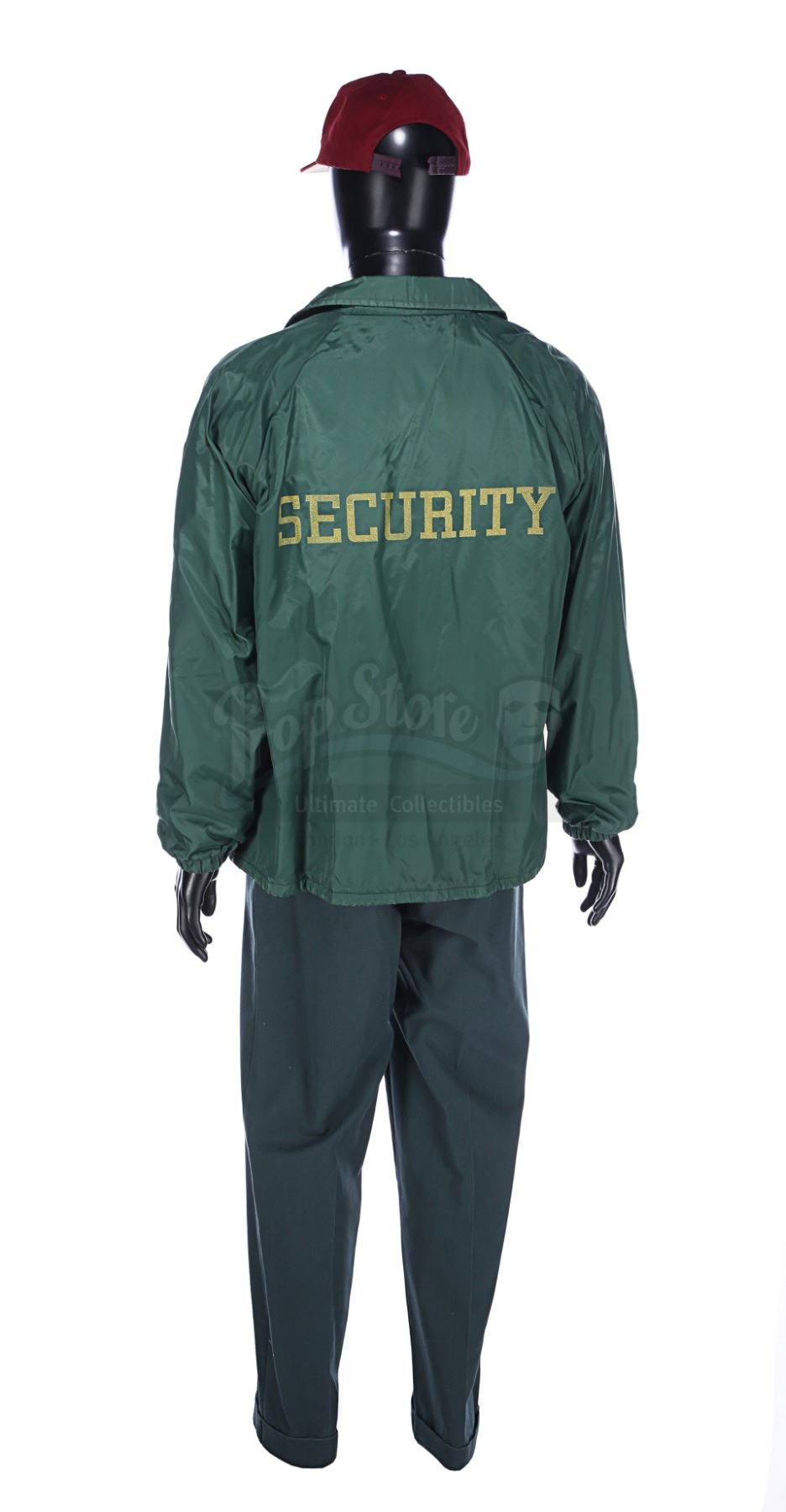 The costume comprises a red cap; a floor-length green nylon hooded rain poncho; a green nylon Auburn sportswear jacket (size L); a short-sleeved light brown polyester blend shirt; a grey Calvin Klein T-shirt (size M) and a pair of teal cotton trousers featuring turned-up hems. Three of the garments feature the letters "FSU" - an abbreviation of Franklin State University - in red and yellow, and several components display the word "Security" in yellow. The costume displays signs of production use, including staining around the inside of the jacket neckline, light marks on the trousers and trailing threads on the shirt. The ensemble comes with a letter of authenticity from a senior crew member.