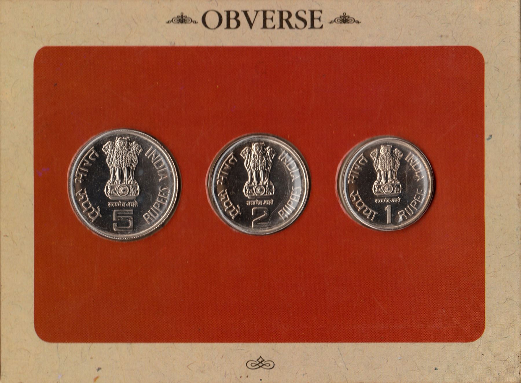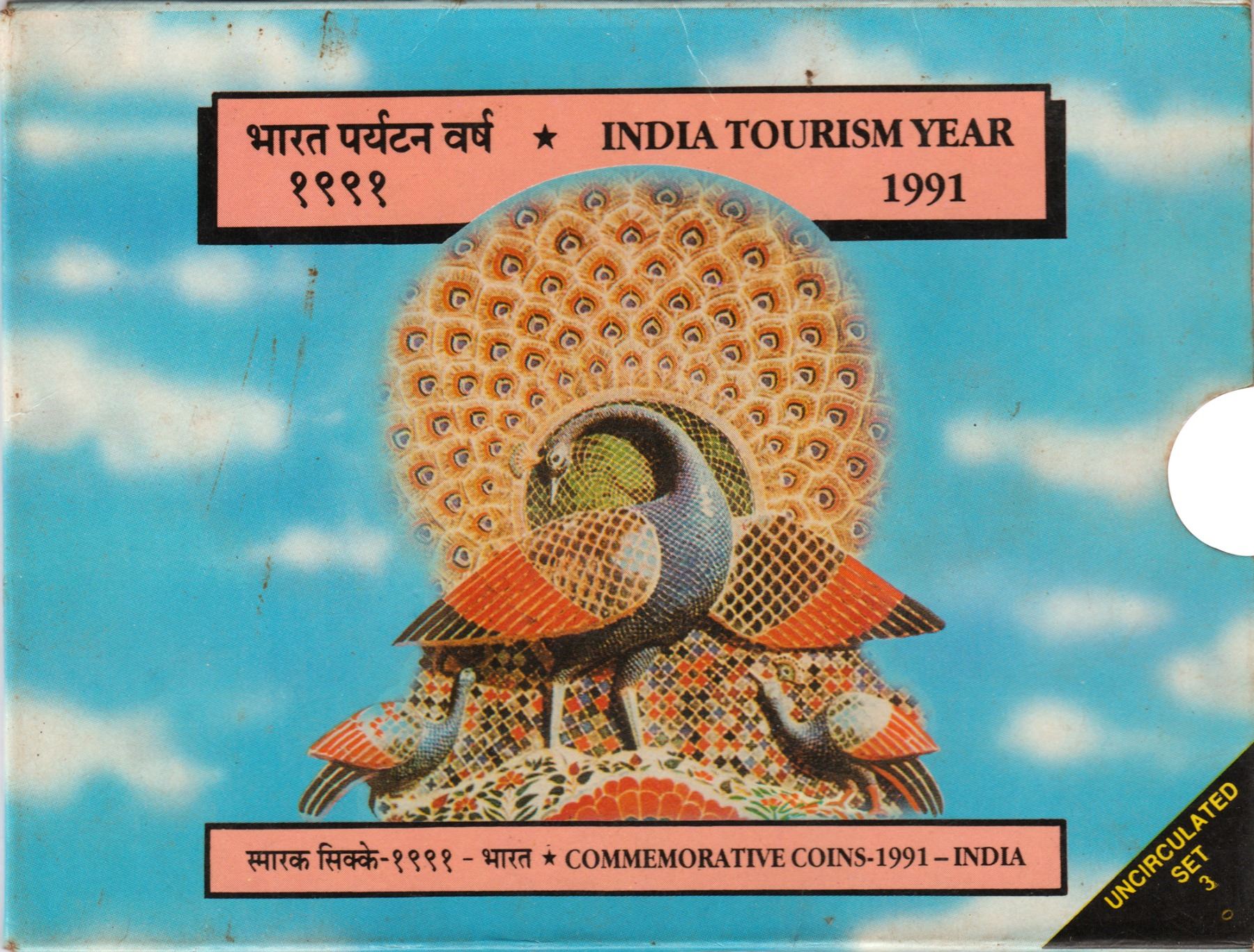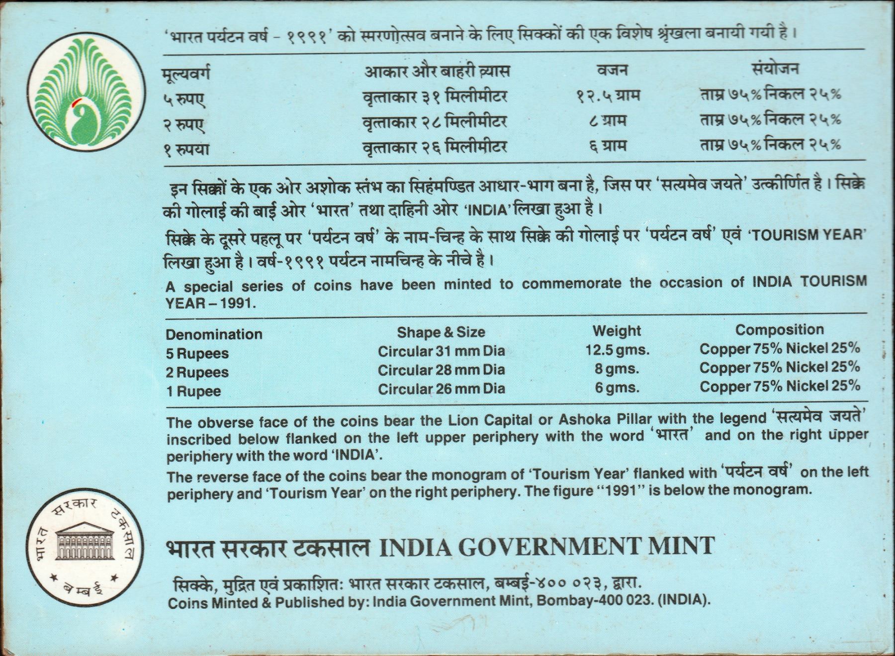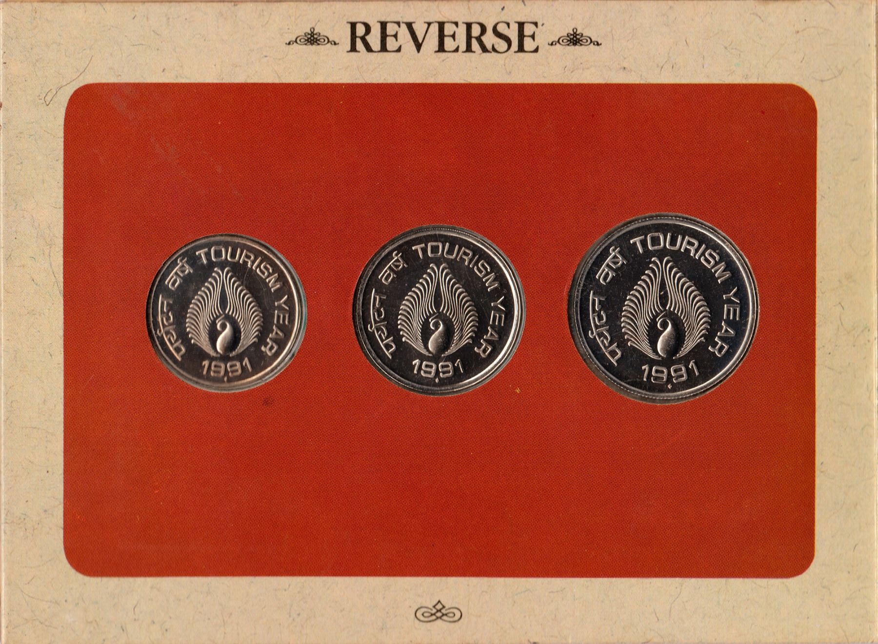 Republic India, 1991, UNC Set, India Tourism Year, Set of 3 Coins, Copper-Nickel, 5 Rupees, 2 Rupees and 1 Rupee, Bombay Mint, (KM # MS 38/RB # 153), intact in the blister pack, preserved in the original packing, UNC.