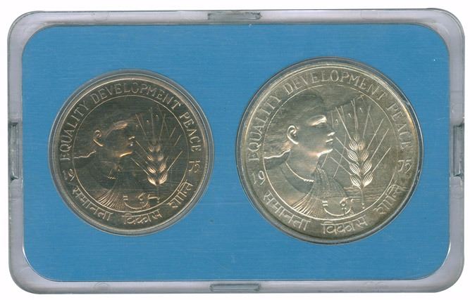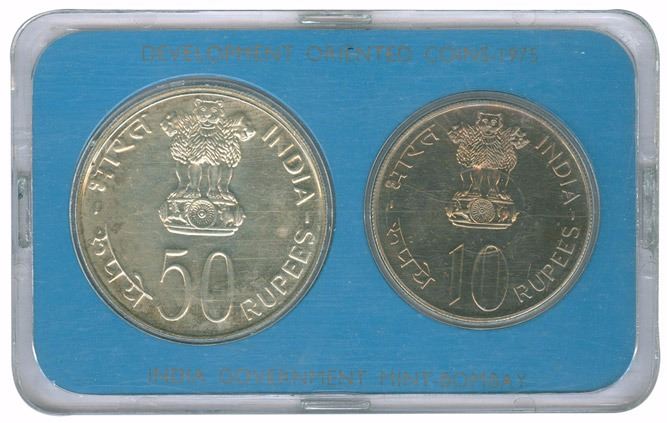 1975, UNC Set,Equality Development Peace, Set of 2 Coins,50 Rupees 10 Rupees,Bombay Mint, (RB # 52), withcertificate, acrylic case torned outer paper cover.