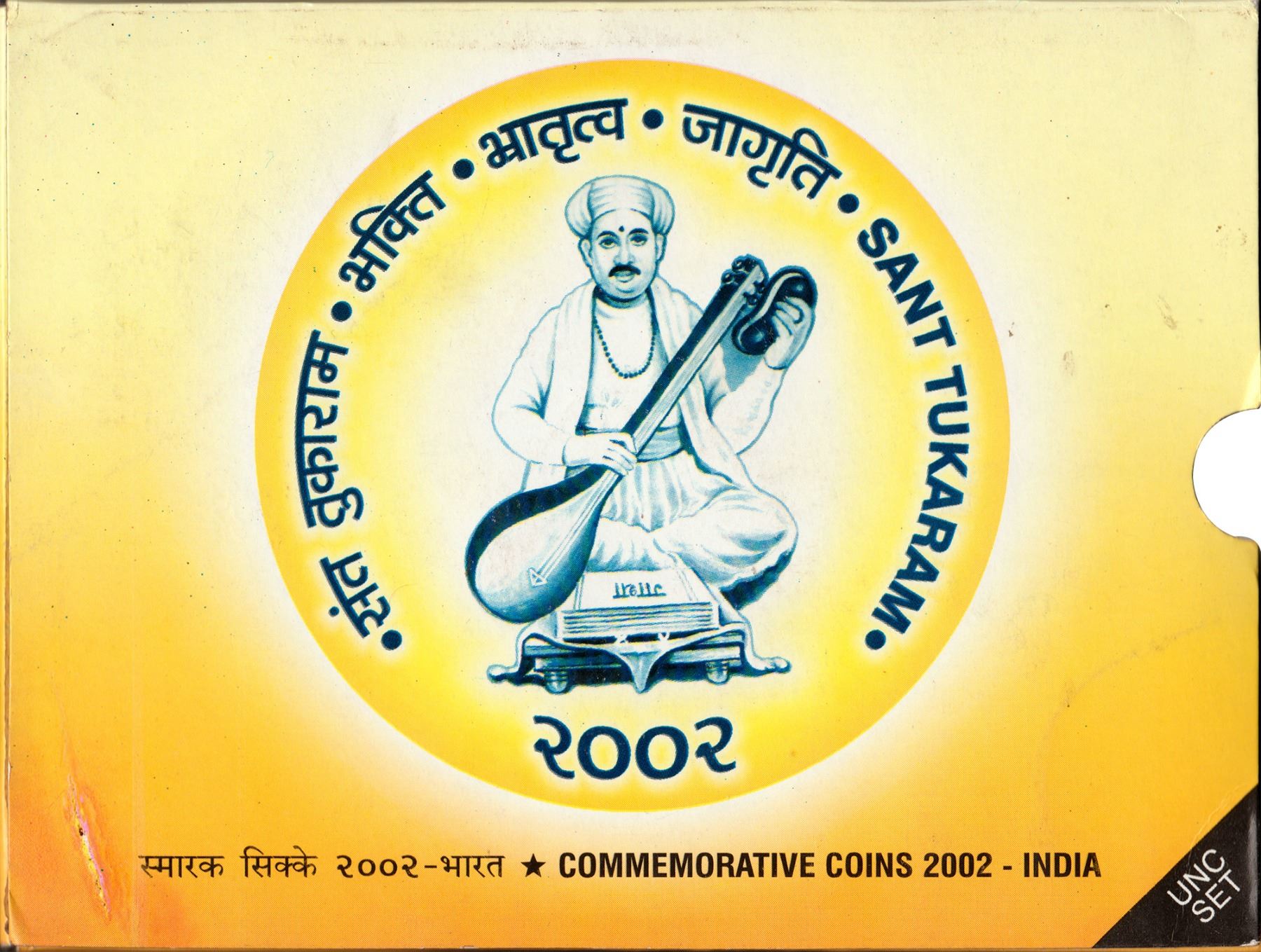Republic India, 2002, UNC Set, Original Strike Issue, Sant Tukaram, Set of 3 Coins, Silver 100 Rupees, Copper-Nickel 50 Rupees & 10 Rupees, Kolkata Mint, (KM # MS 60/RB # 249), intact in the blister pack, preserved in the original packing, UNC.