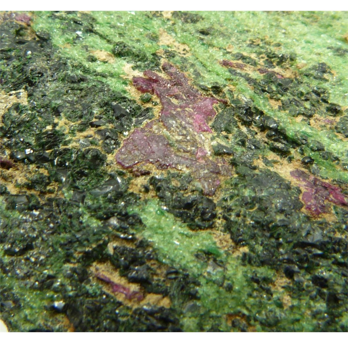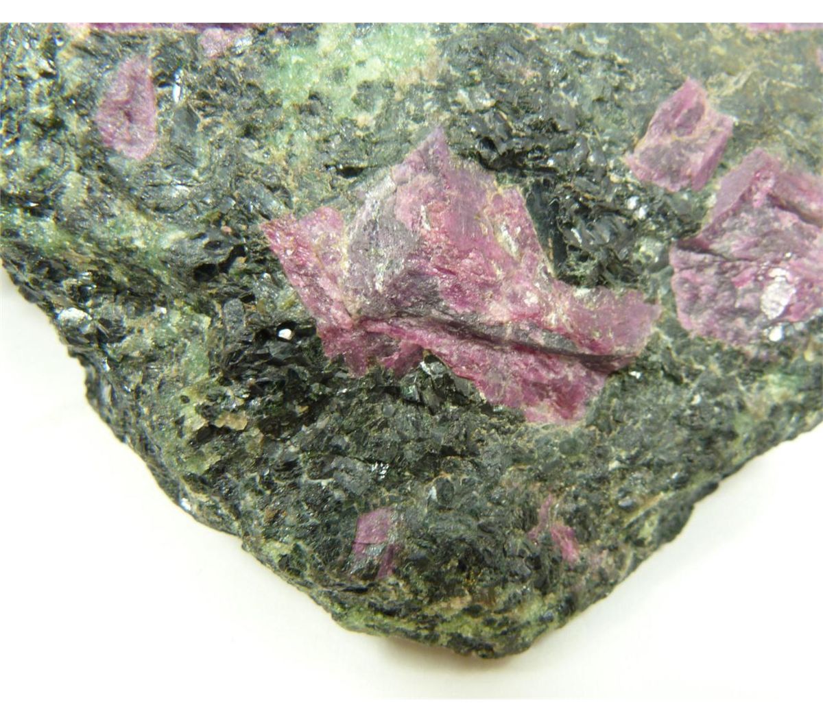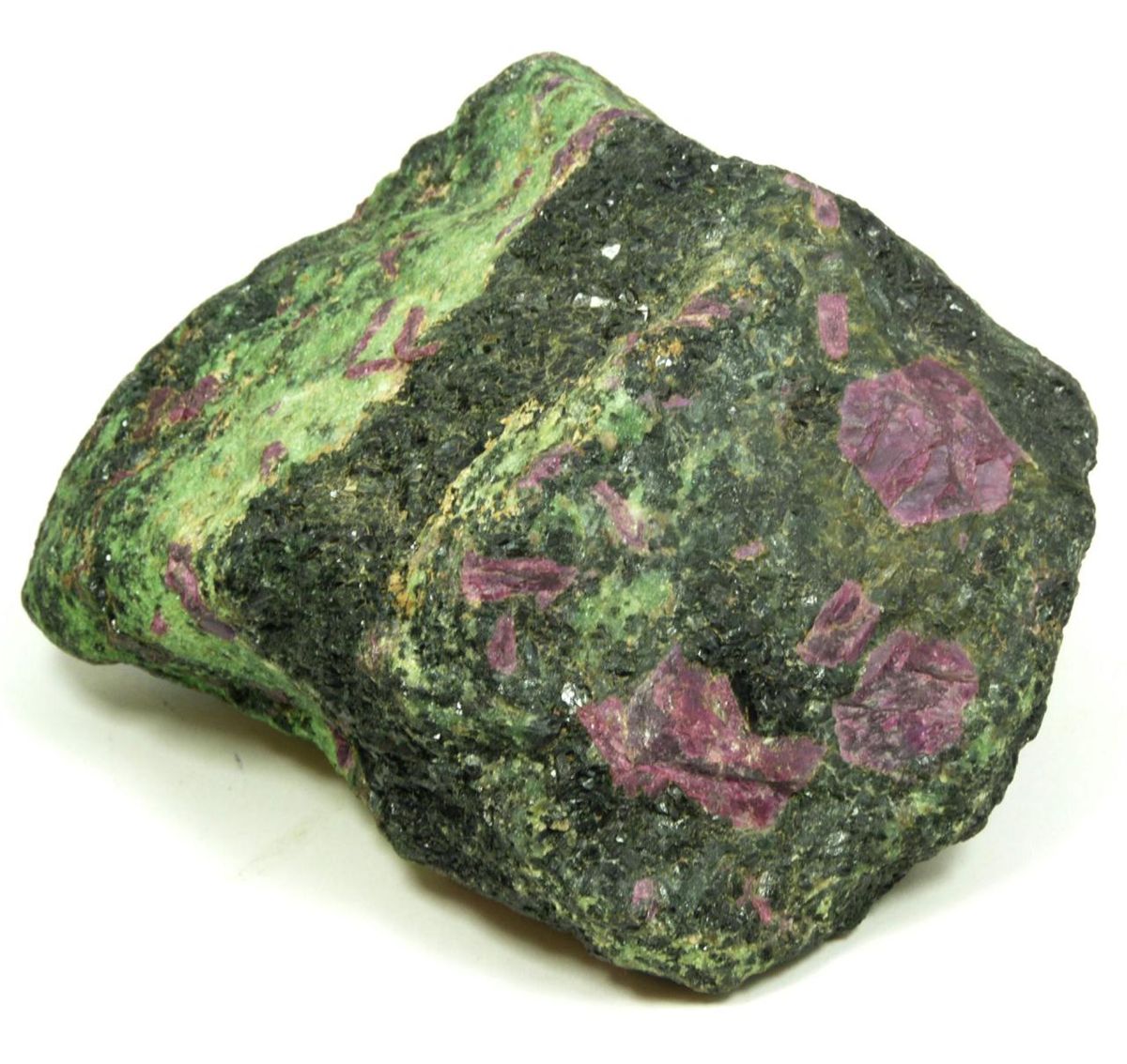 Uncarved zoisite stone with ruby. Measures 3 1/4" height x 6 3/4" length x 6 1/4" depth (8.2cm x 17.1cm x 15.8cm). Total weight of 2257 grams.