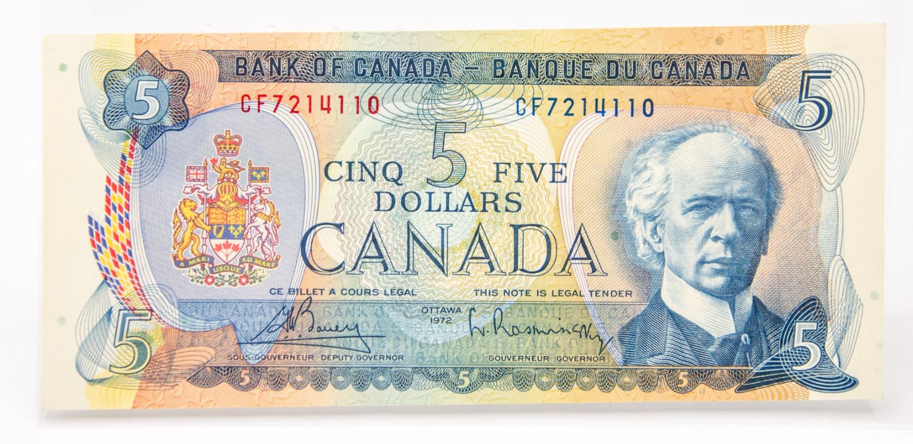 UNCIRC OFFSET 1972 CANADA 5 DOLLAR BILL