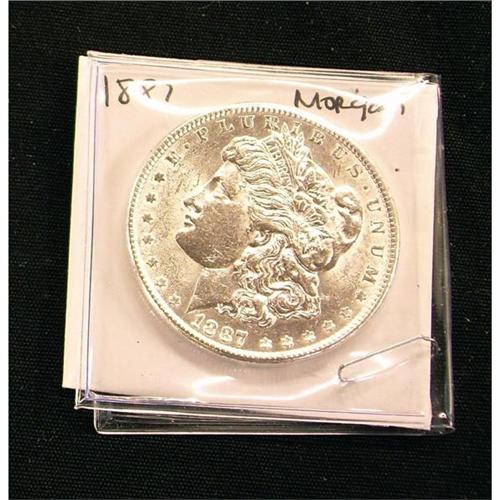 COIN: Uncirculated 1887 US Morgan silver dollar, ungraded, in display sleeve.