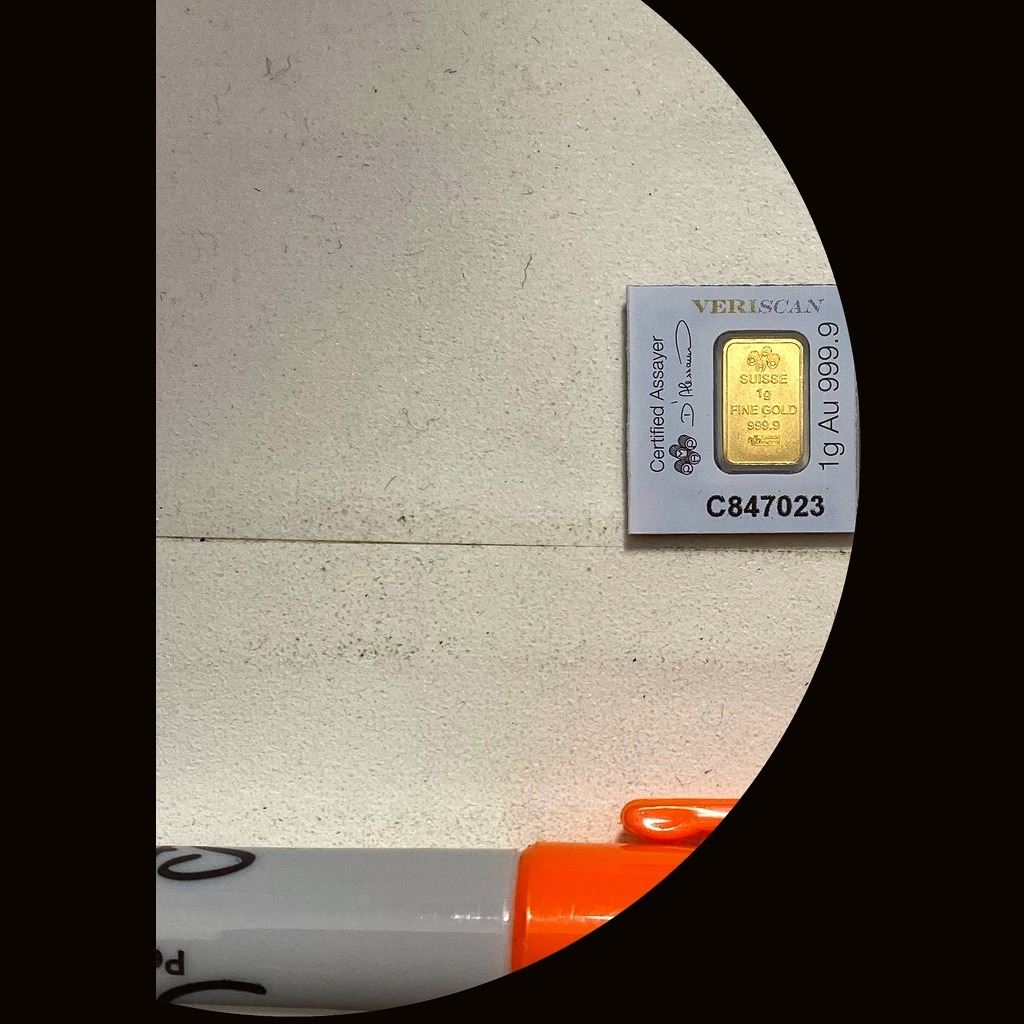 UNCIRCULATED These images show a PAMP Suisse 1g gold bar 999.9 fine with Veriscan certification.